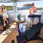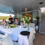 The Interior is characterized by a palette that includes an elegant mix of shades grey that recalls the colour of the exterior and blend well to honey- colored wood floors 100 years-old oak Matt White ceilings and walls. The plush sofa of the living room made with fine leathers and fabrics from the darker colours create a pleasant contrast effect. The dining area has a basic aluminium table which can accommodate 8 people. The four cabins are all equipped with private bathrooms and closets area Separate galley and crew mess.