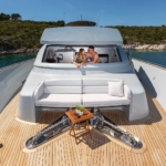 Rigorous and essential lines of the Interior gives this boat a unique style that employs essential materials such as titanium and lacquer paints. The Interior is characterized by a palette that includes an elegant mix of shades grey that recalls the color of the exterior and blend well to honey–colored wood floors 100 years–old oak Matt White ceilings and walls. The plush sofa of the living room made with fine leathers and fabrics from the darker colors create a pleasant contrast effect.