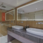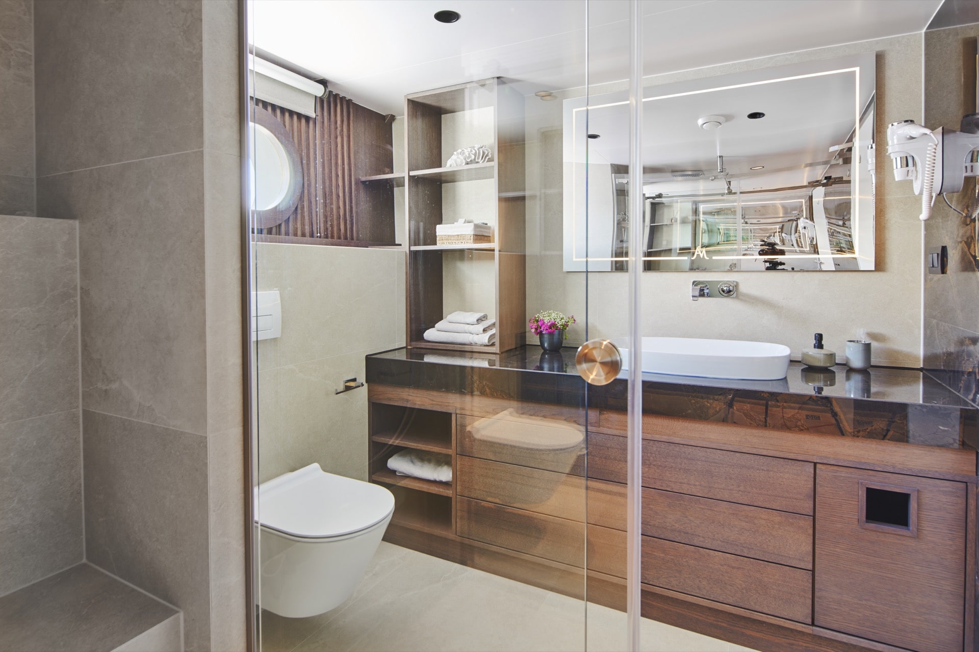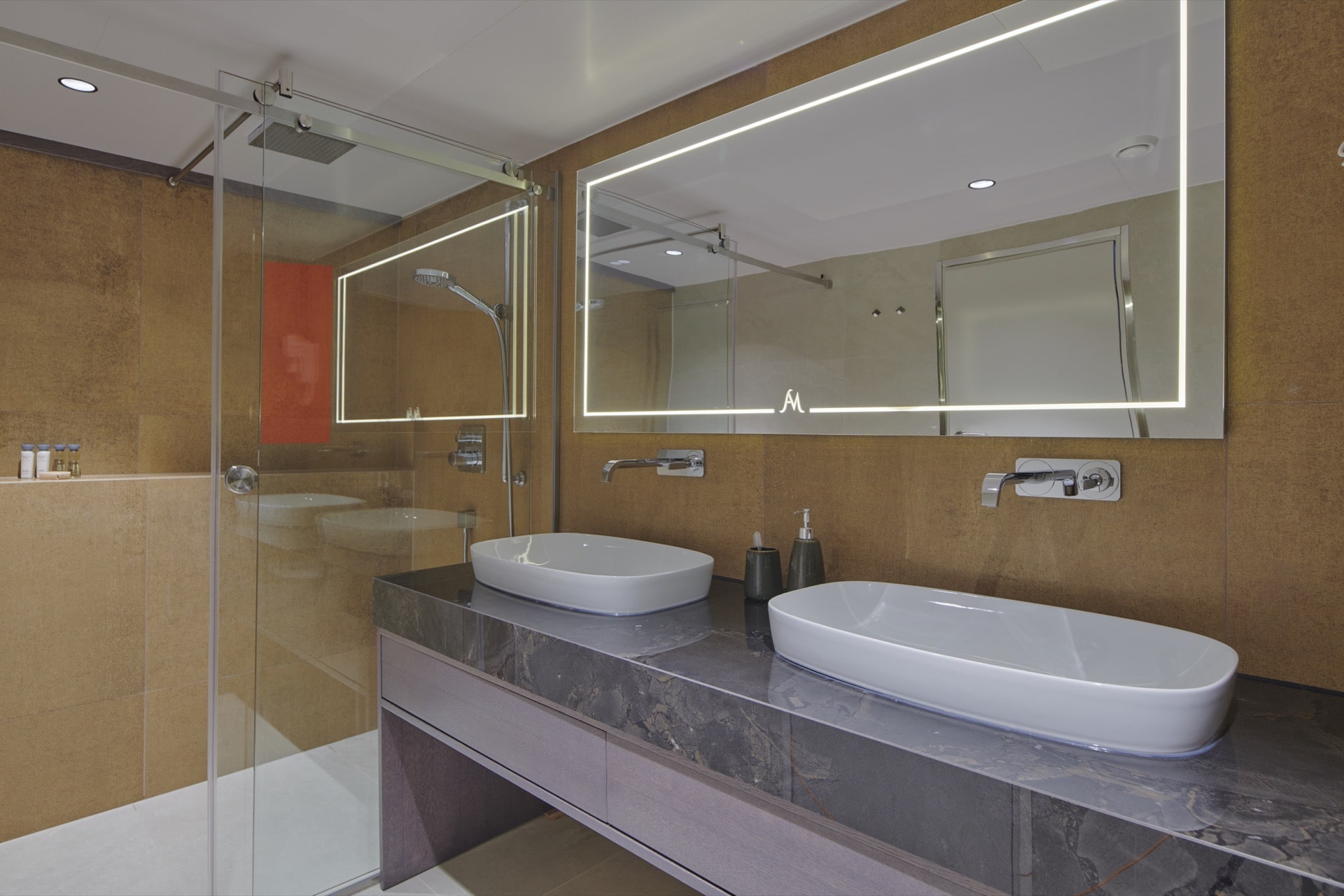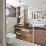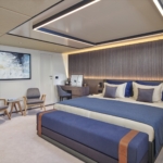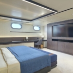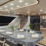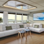 - The Main Saloon combines a dining area with an elegant bar and lounge seating area with TV, DVD, USB