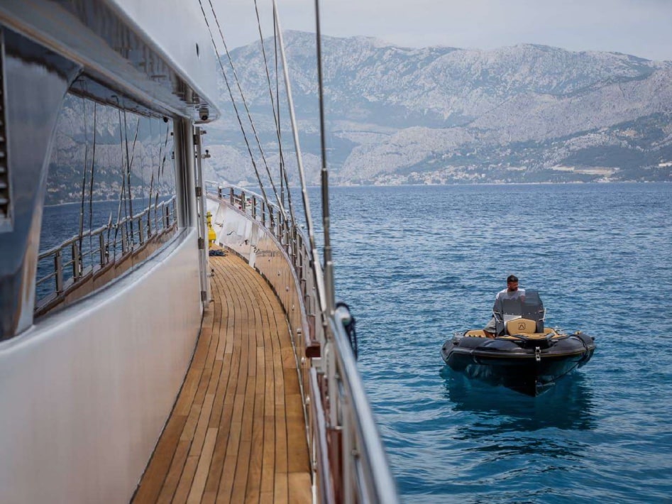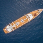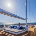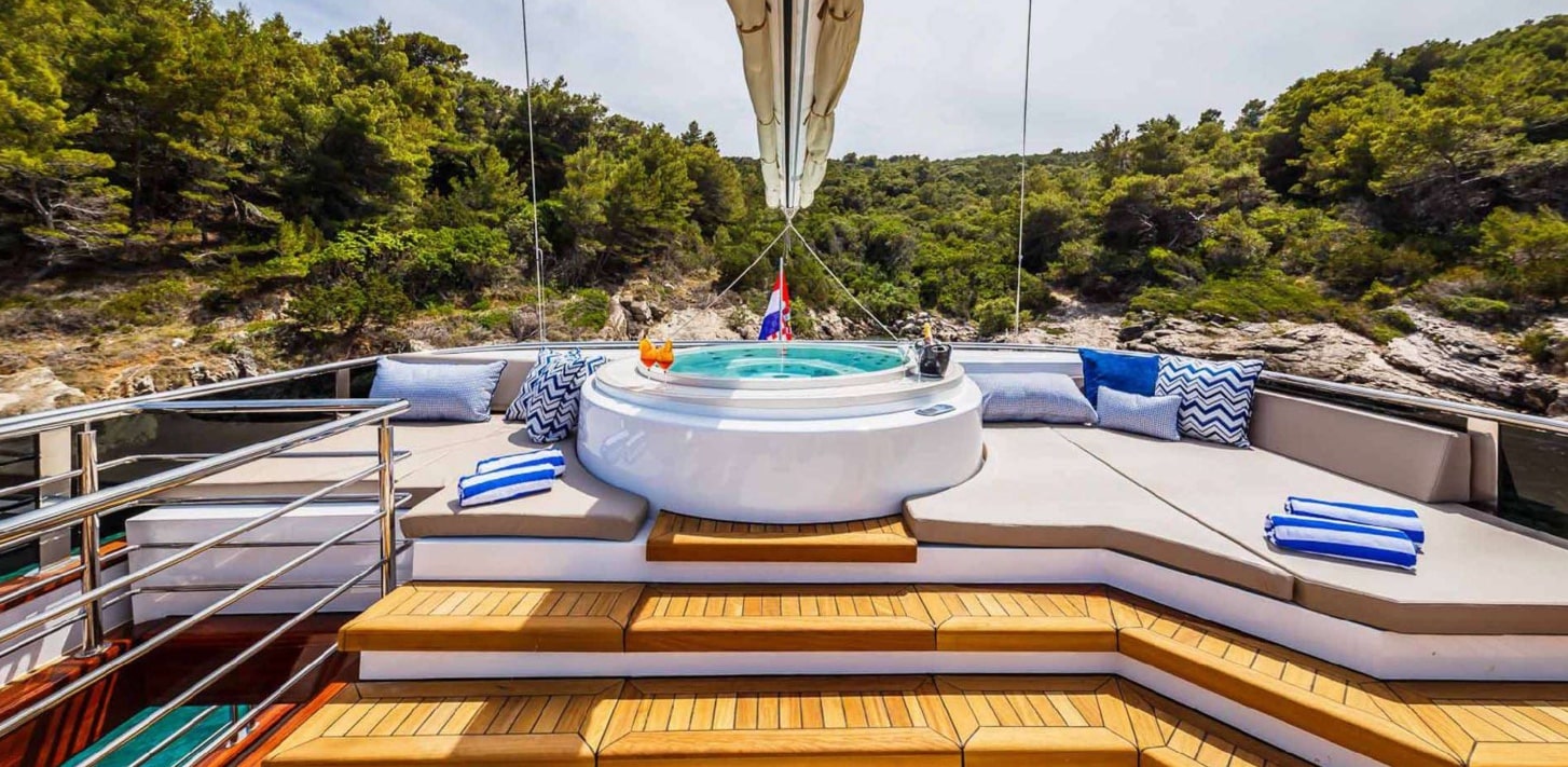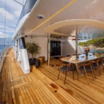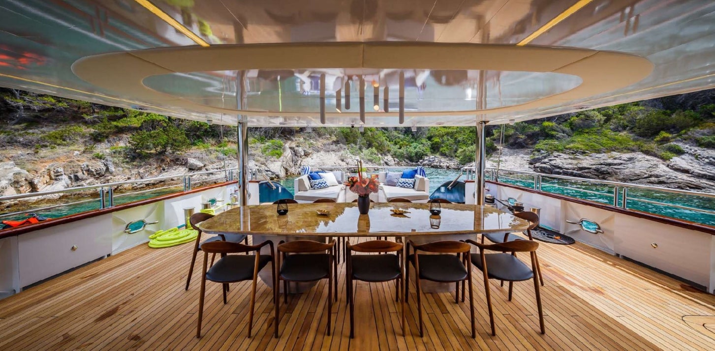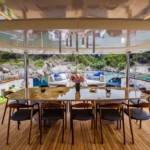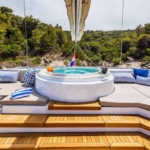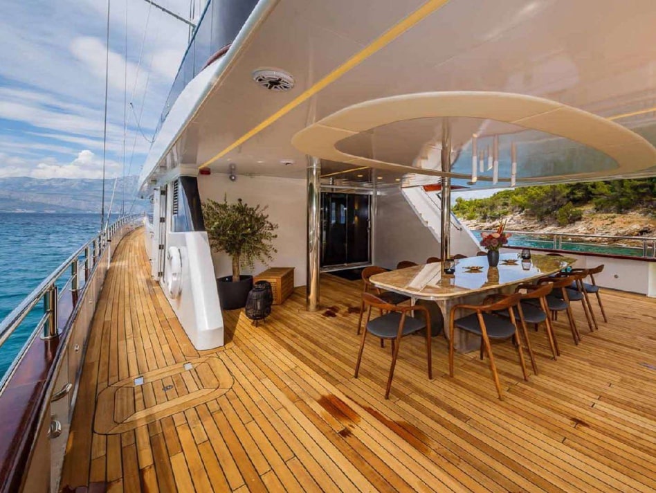 Outside speakers, Deck with dining area, Indoor dining, Minibar outside, Separate cabins for cews, Sun Mattresses, Ice maker, Summer tent, Coffee machine, Electric fridge, TowelsSafety equipment:
