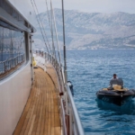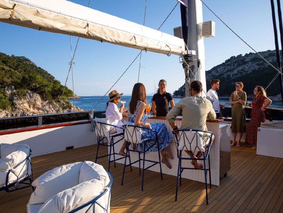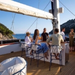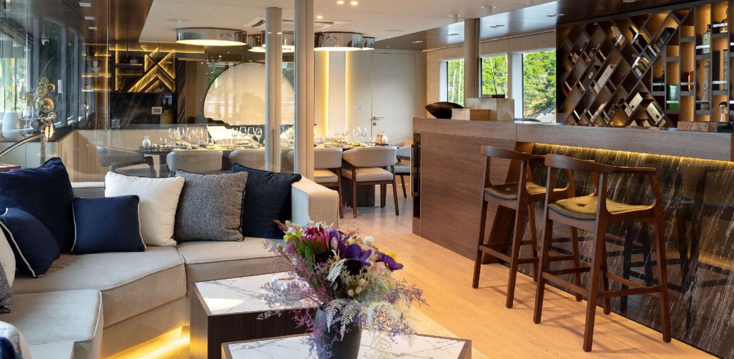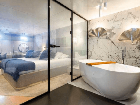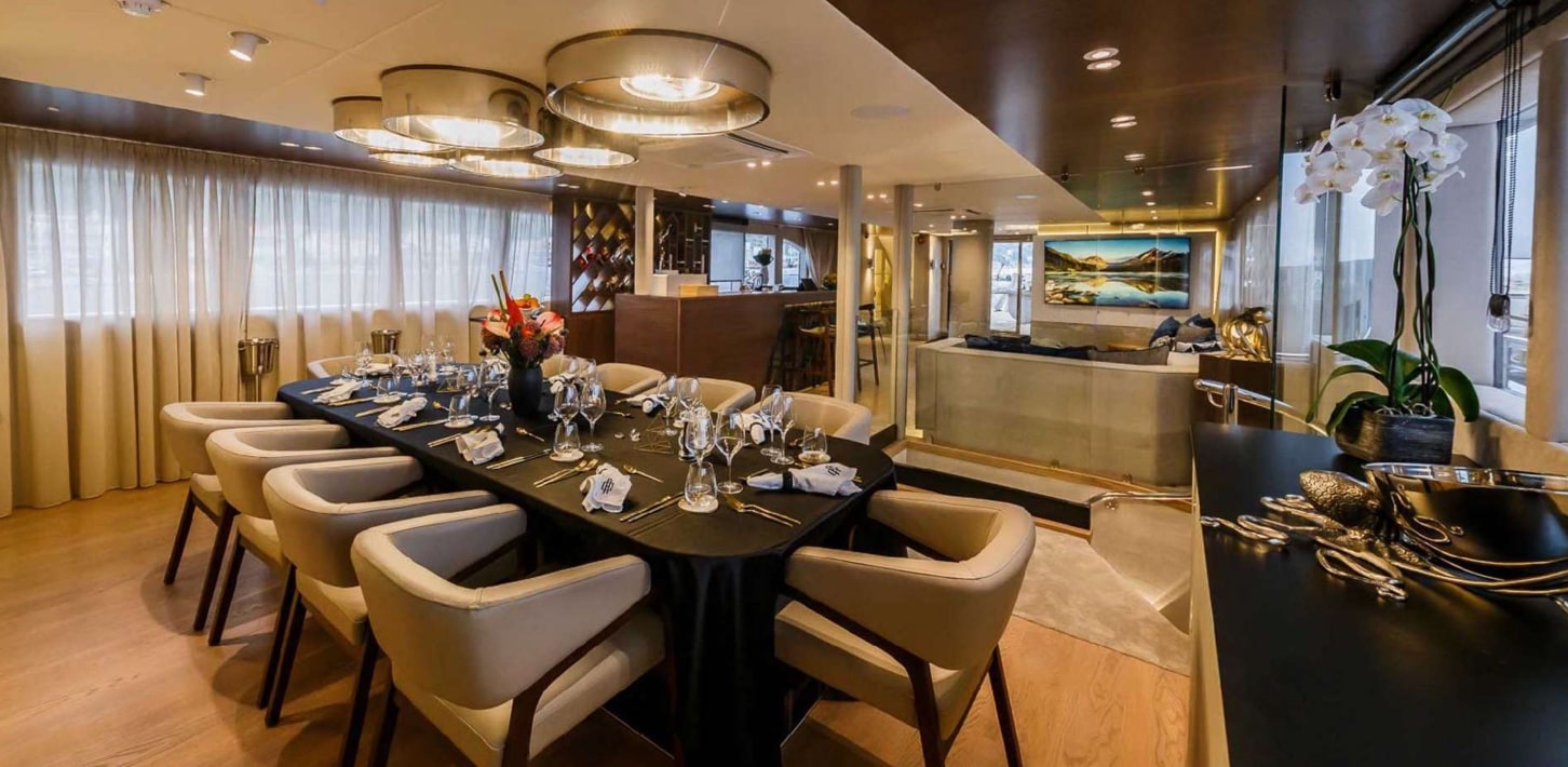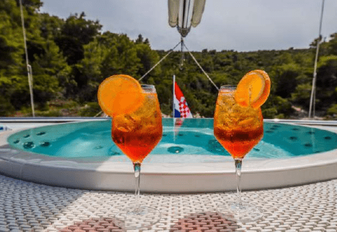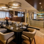 Outside speakers, Deck with dining area, Indoor dining, Minibar outside, Separate cabins for cews, Sun Mattresses, Ice maker, Summer tent, Coffee machine, Electric fridge, TowelsSafety equipment: