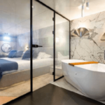 Outside, a vast sundeck boasting a jacuzzi for 8, huge sun loungers, a fire pit, a wet bar, and a TV projector, makes a great place for socializing and relaxation.