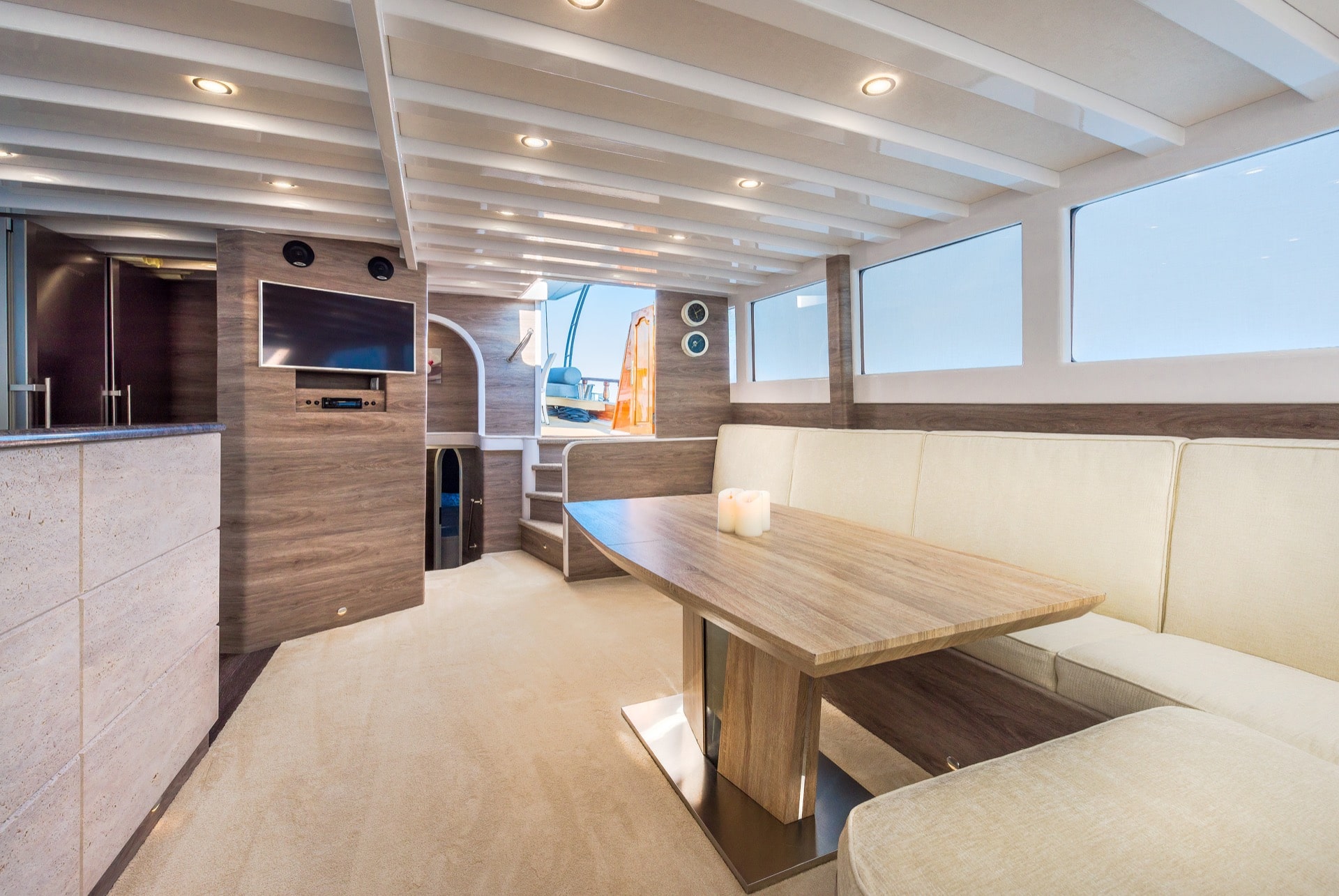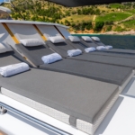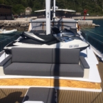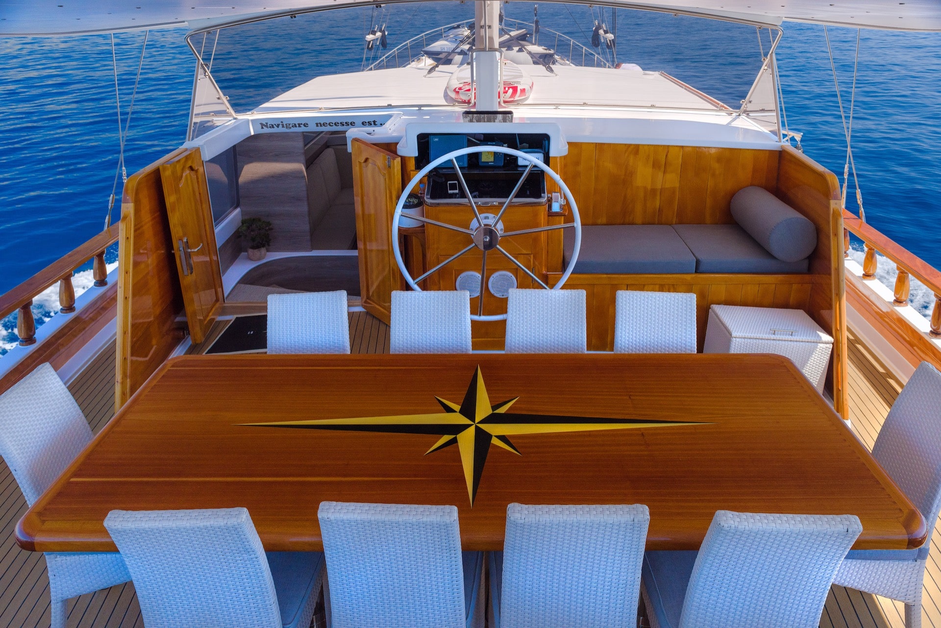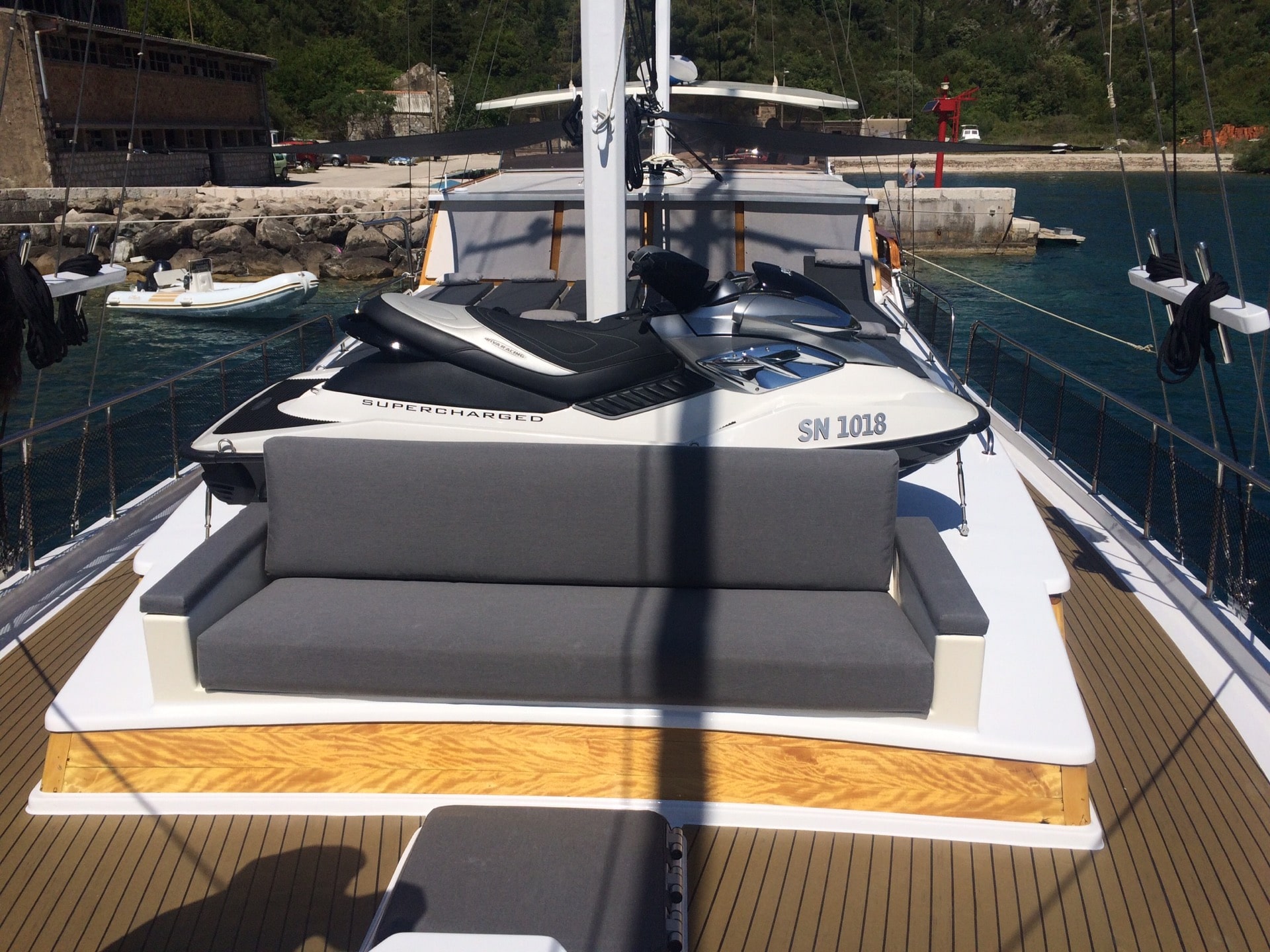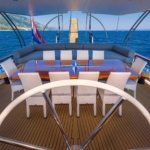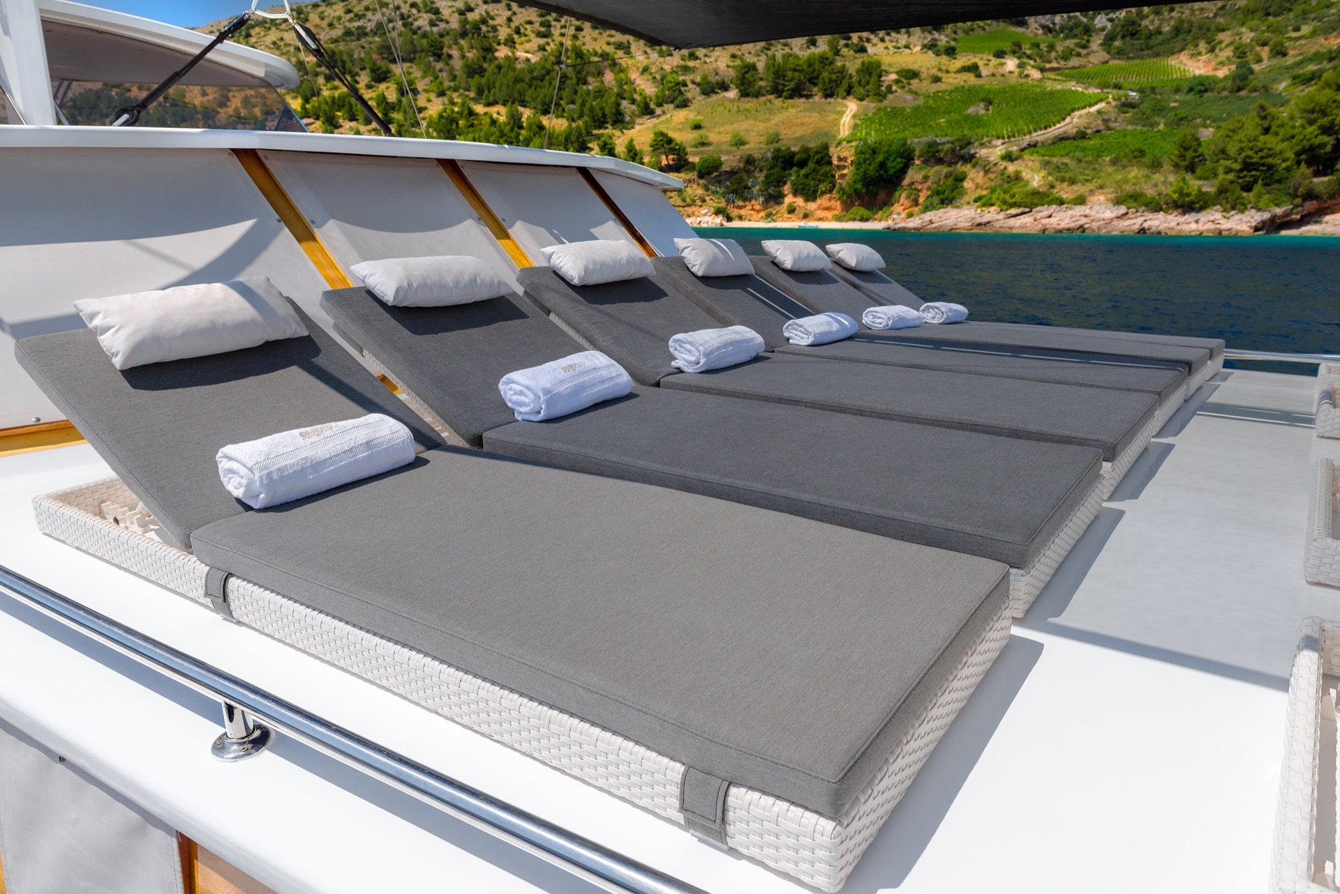 Deck: The back of the ship has a hard top covered dining area with dining table and chairs, combined with a big cushioned sofa. The front of the boat features a large area with sun mattresses and comfortable sofa.