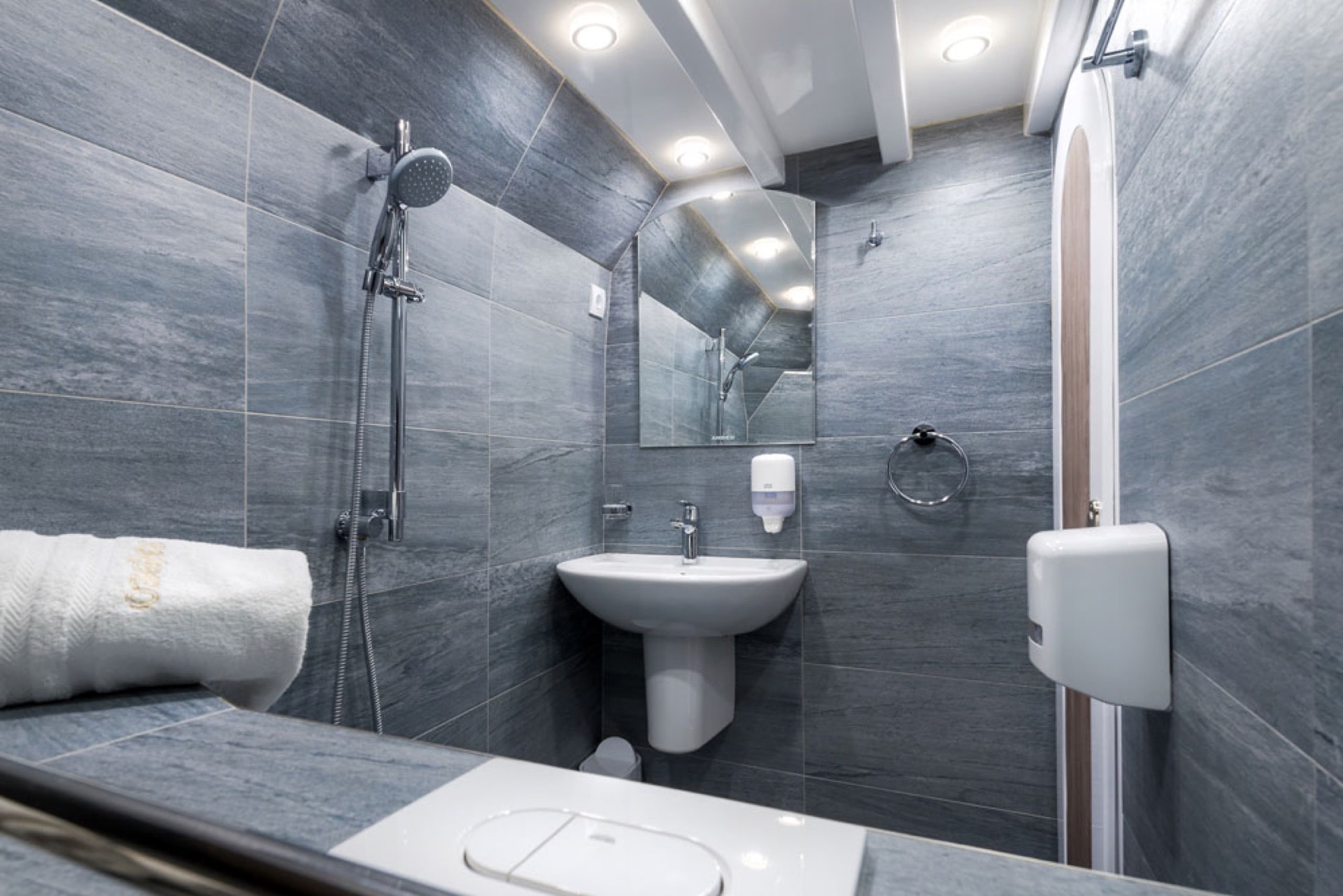 - Each of the cabins has wardrobe, 24 V/220 electricity, hair dryers, its own en-suite bathroom, home like, with shampoo, toilet paper, soap, shower: out of wall.