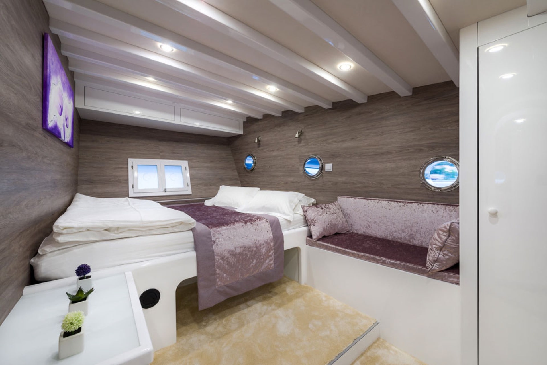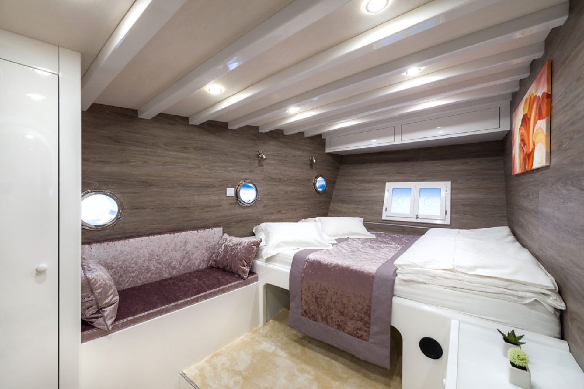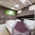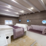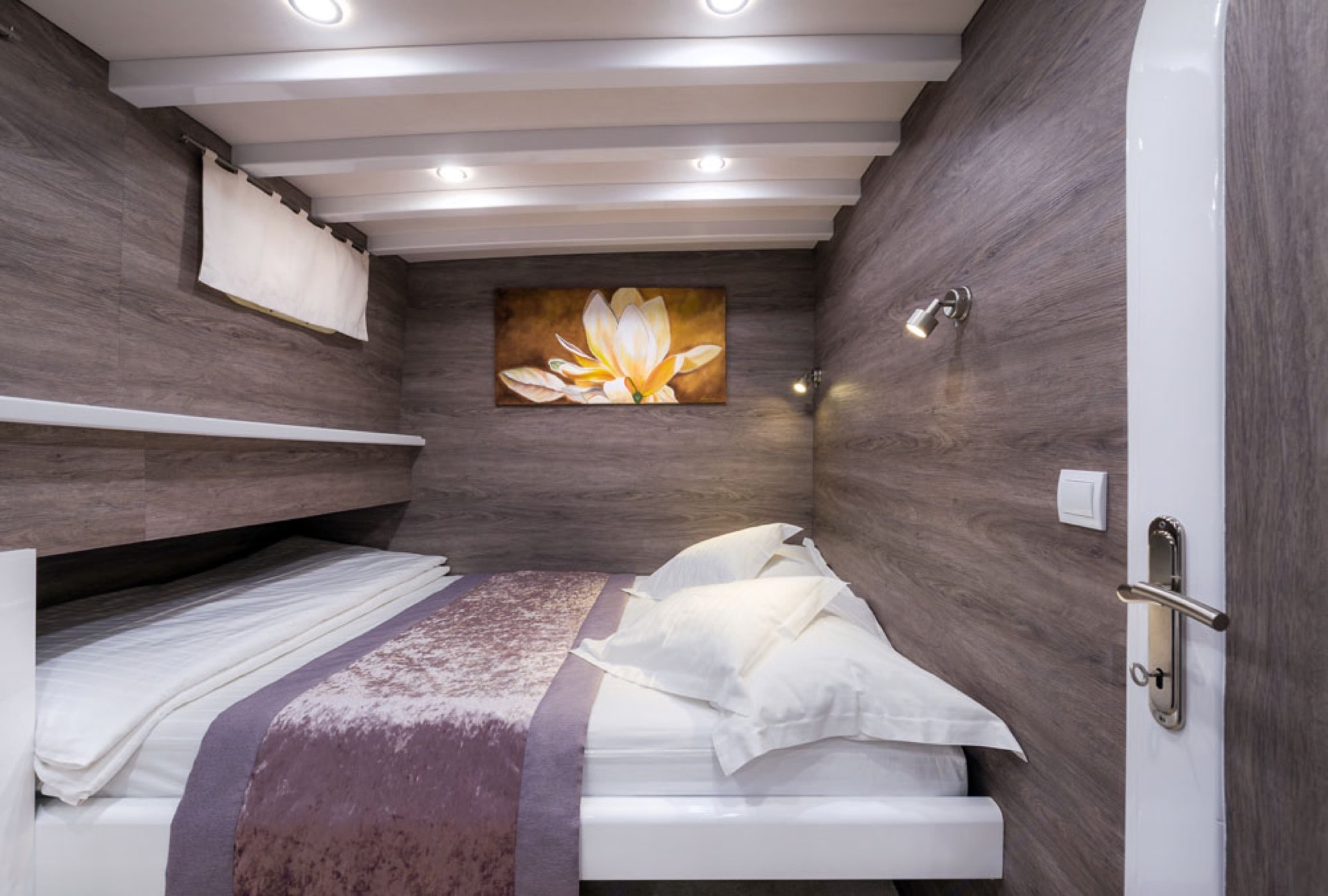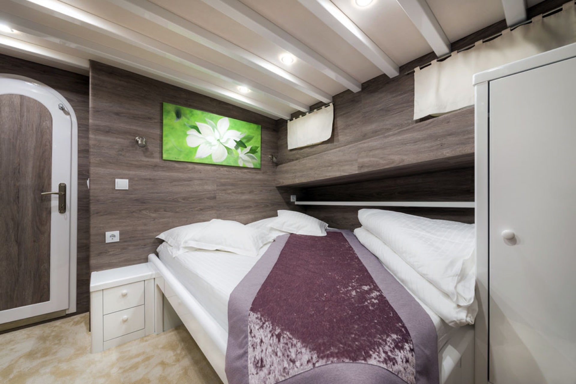 Salon areas: The salon is an exquisite combination of modern and traditional, with highly polished dark and light wood. The salon has a dining table and sofa, as well as the boat bar and the galley. The corridors lead to 4 cabins in the front of the ship and 1 cabin in the back. The cabins are unique, different from any other gulet in the Adriatic, with a very contemporary look and lovely decorated bathrooms