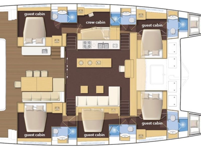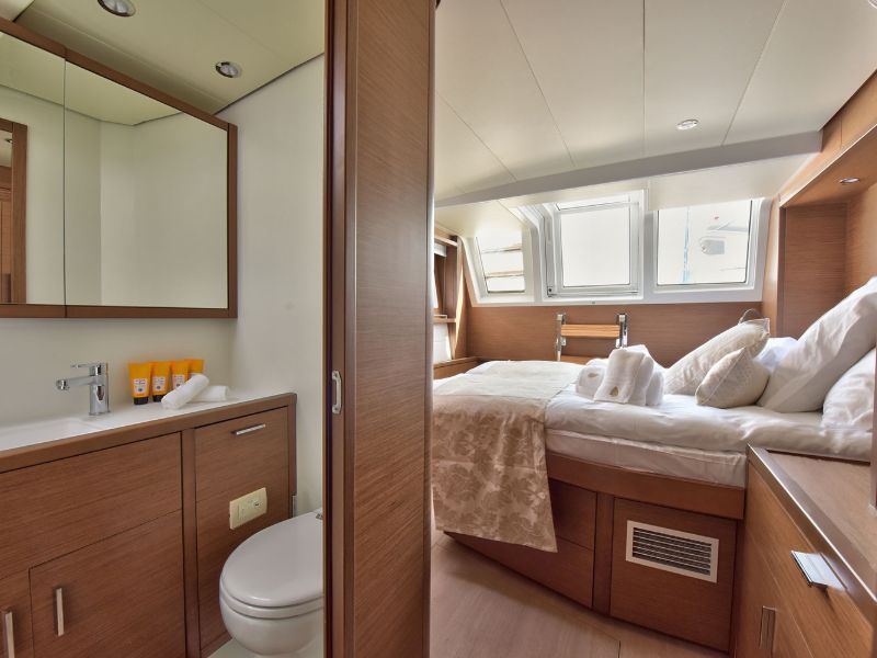 - owner’s cabin in the starboard hull with private sitting area and direct access to the cockpit
