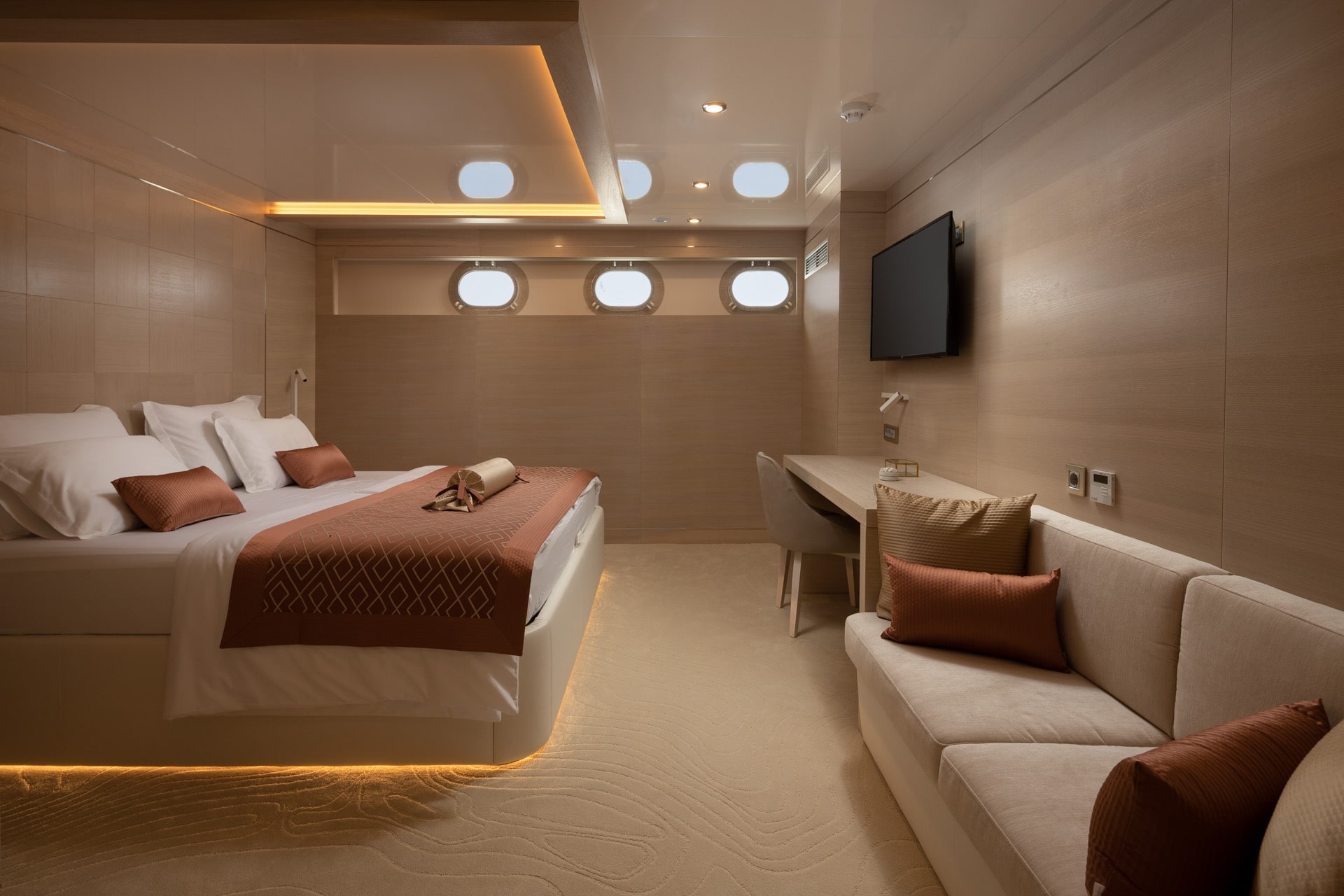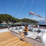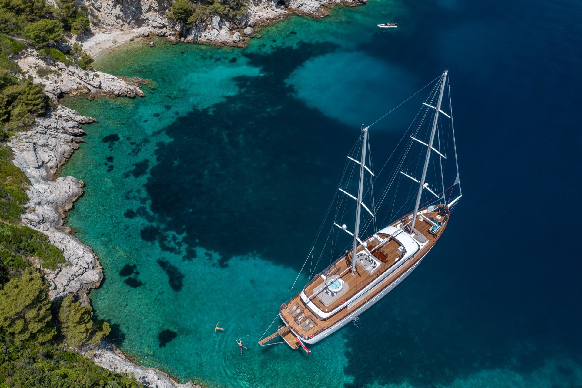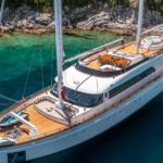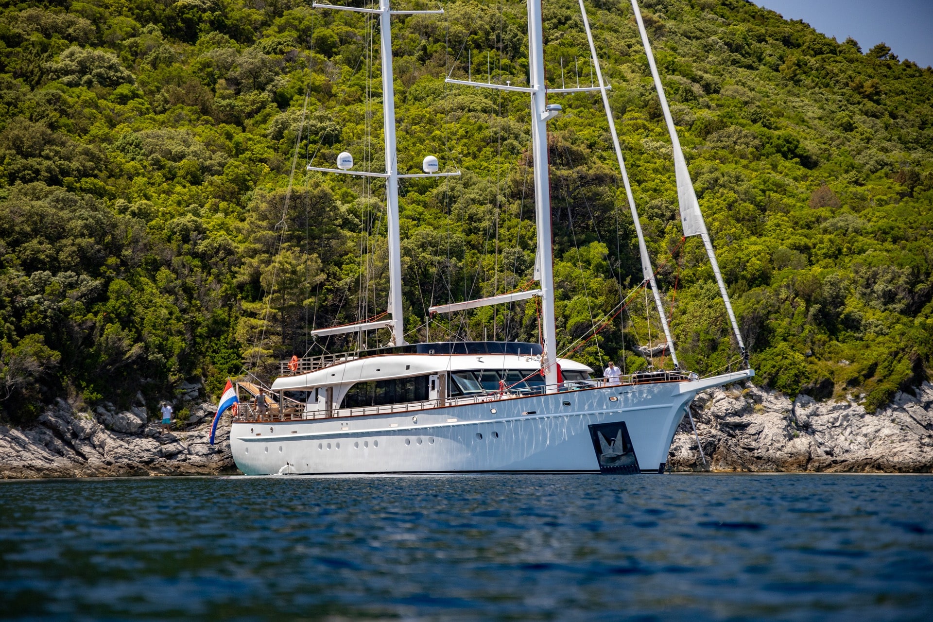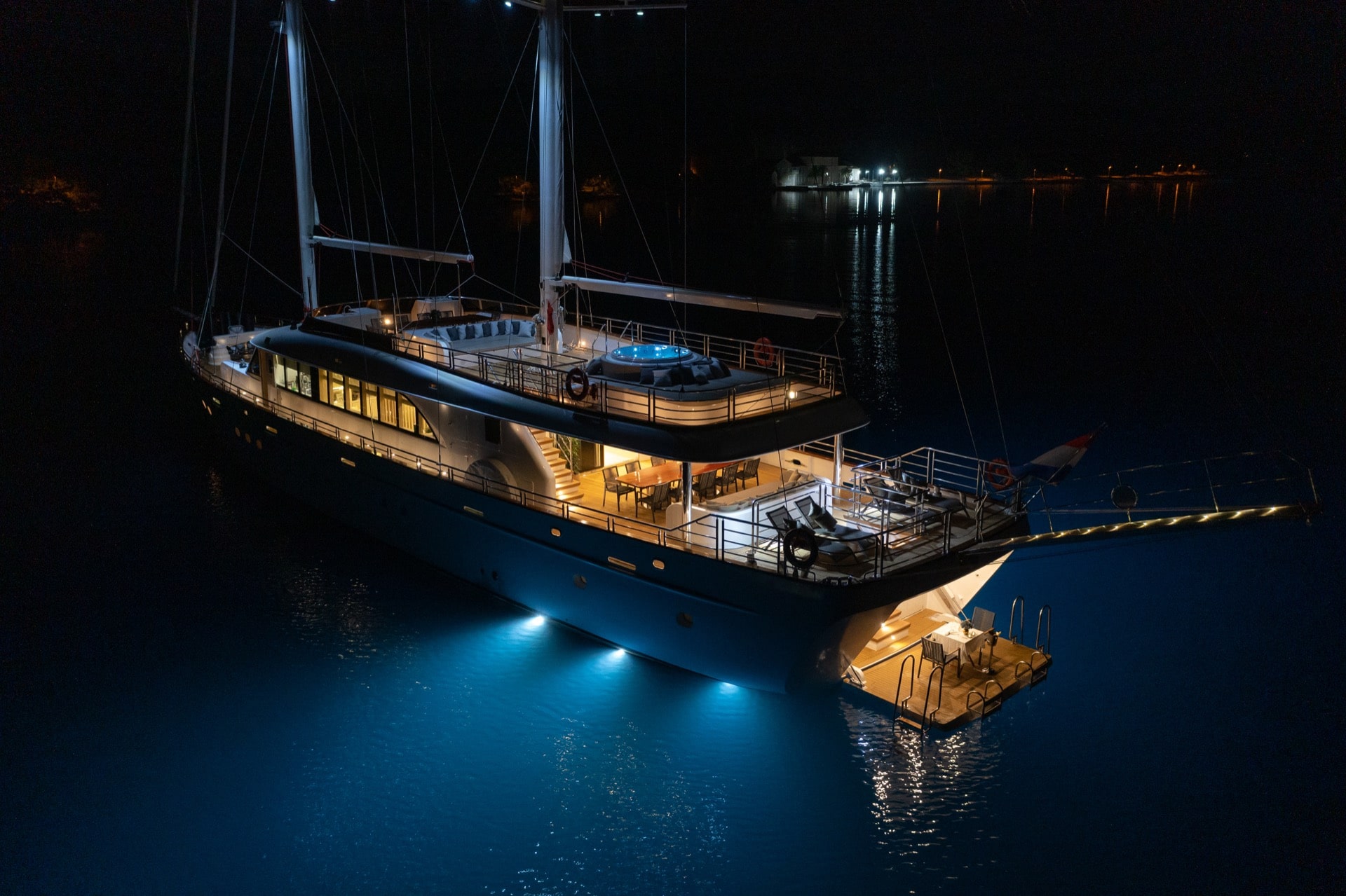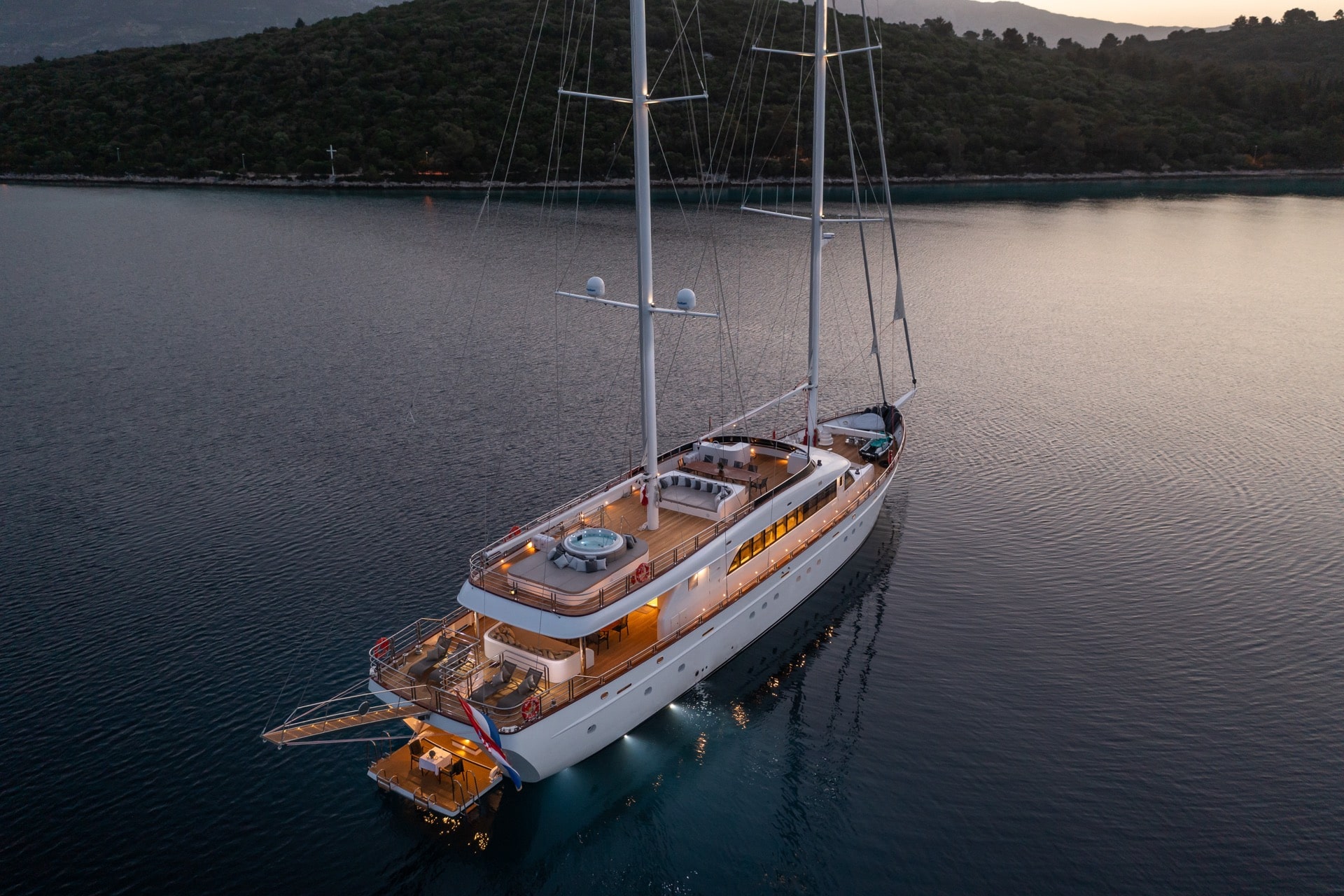 LOVE STORY is a new luxury sailing yacht, the third in line of boats owned by the Trgo family out of Sumpetar, Jesenice they are proud and excited to present this 6 cabin sailing beauty. With two of these cabins being spacious master cabins over 25 m2 in size, and two triple and two double cabins, Love Story can accommodate 12(+2) pax. Within 43.25 m length over all, Love Story combines modern and luxury interior with a spacious and functional exterior where everyone can find their own place to relax and enjoy the peace and beauty of the Adriatic in its fullness. With a lot of cushioned areas on every corner, everyone can find a favorite spot to enjoy their first morning coffee or cocktail in the sunset. Beautiful dining area on the flybridge will provide you with a unique gastronomy experience while enjoying stunning views.