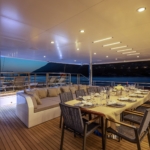 The aft deck has a cushioned platform offering an abundance of space with a beautiful dining table for al- fresco dining. Hard top at the aft deck providing lots of sun shade.