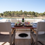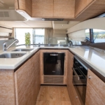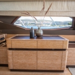 Salvagni uses extremely rich materials to conjure up the idea of the voyage, practical and sophisticated, with a close eye for detail and fine finishes, which represents an absolute novelty in the world of yachts this size. Only one step from living area to galley