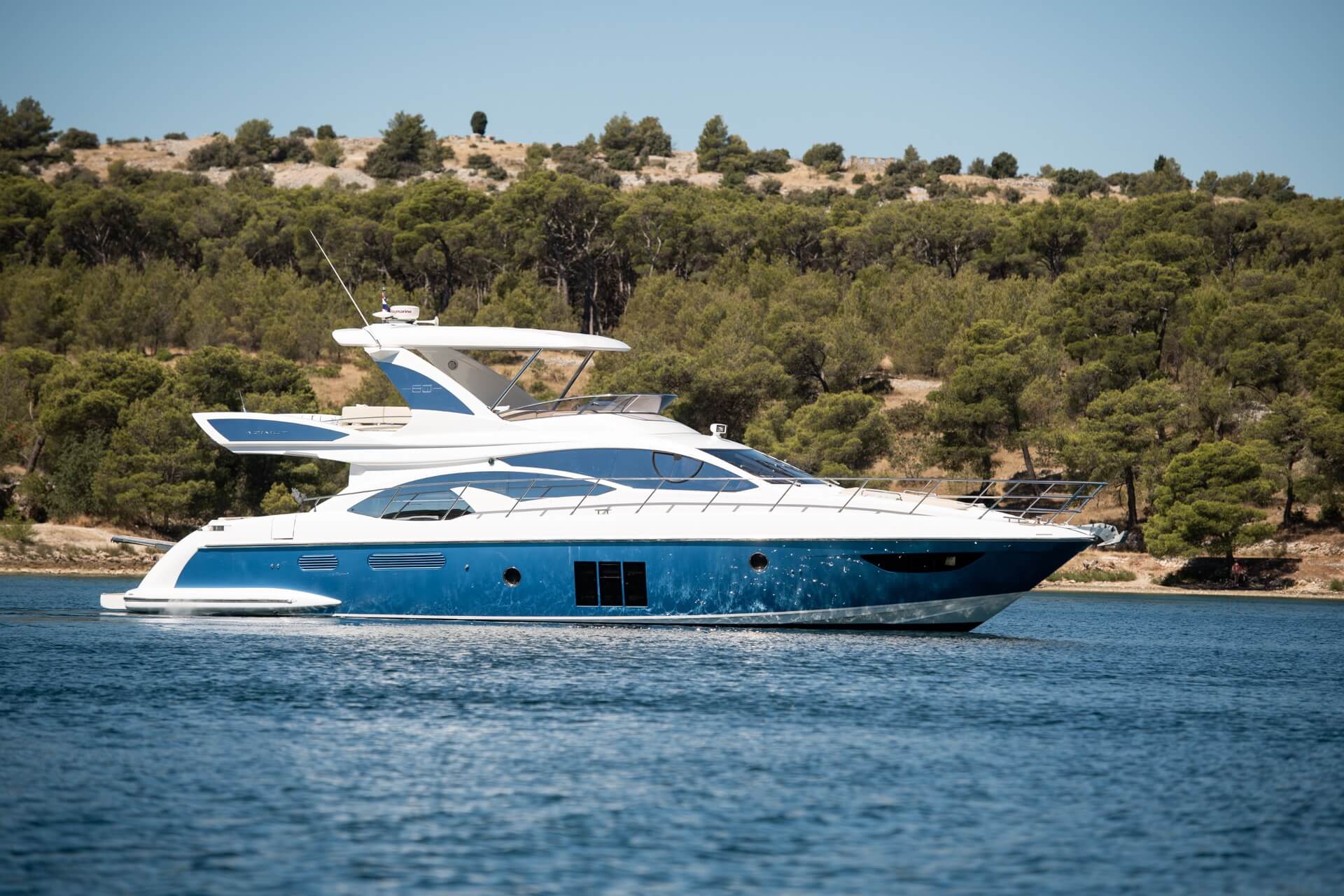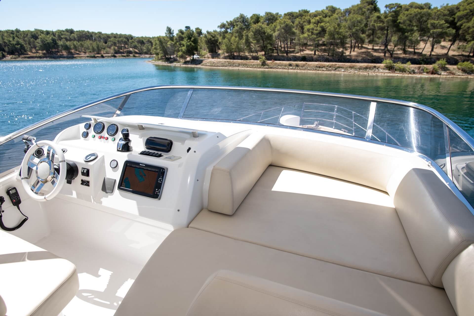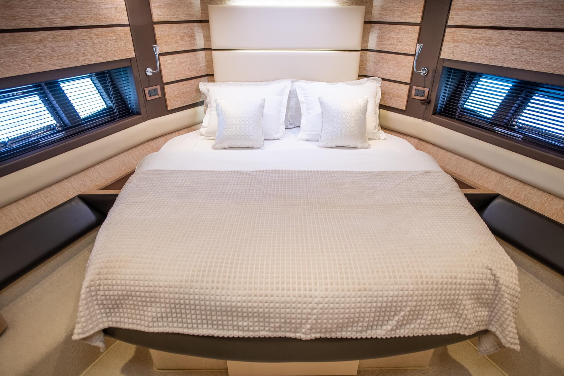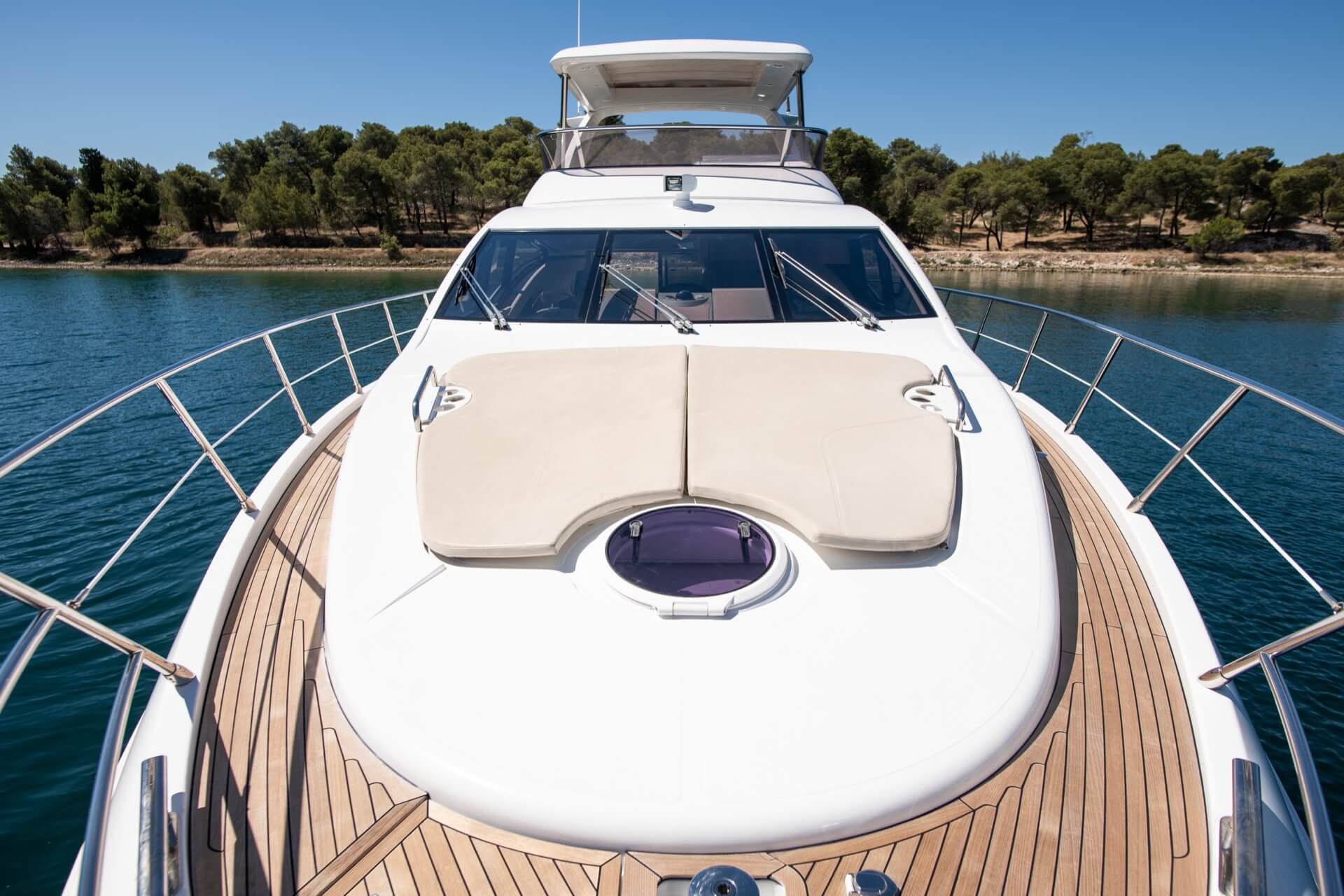 Impressive look and additional space in lowerdeck and bow cabine. Full height windows in salon for convertible dinette/lounge zone. New 6 sqm (on 60-feet yacht) fore deck lounge convertible solution with bow bimini top with carbon fiber bimini poles. Extended flybridge becomes even more longer in new generation Azimut flybridge yachts. Flybridge supports have additional feature of privacy curtain with electric system and remote control.