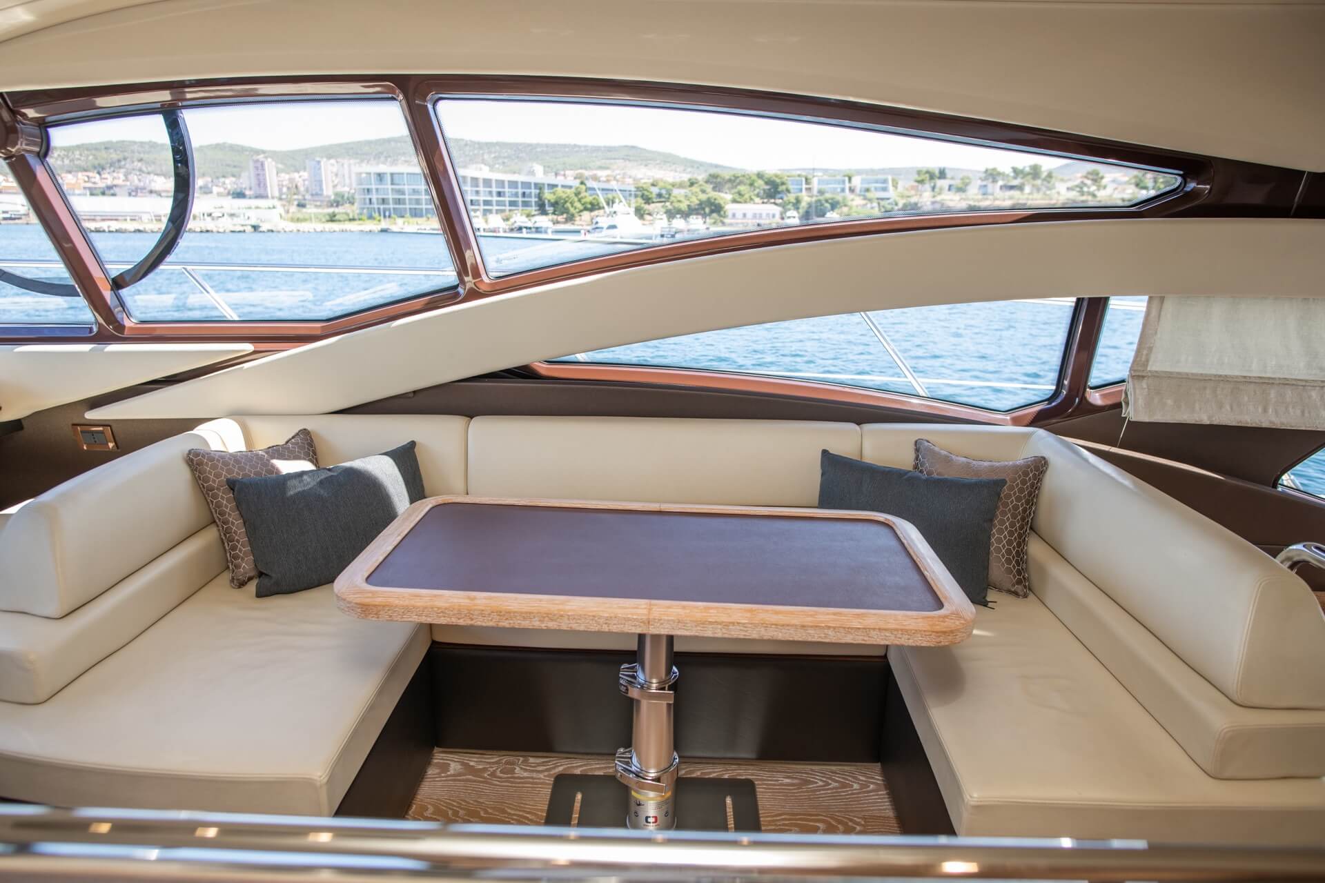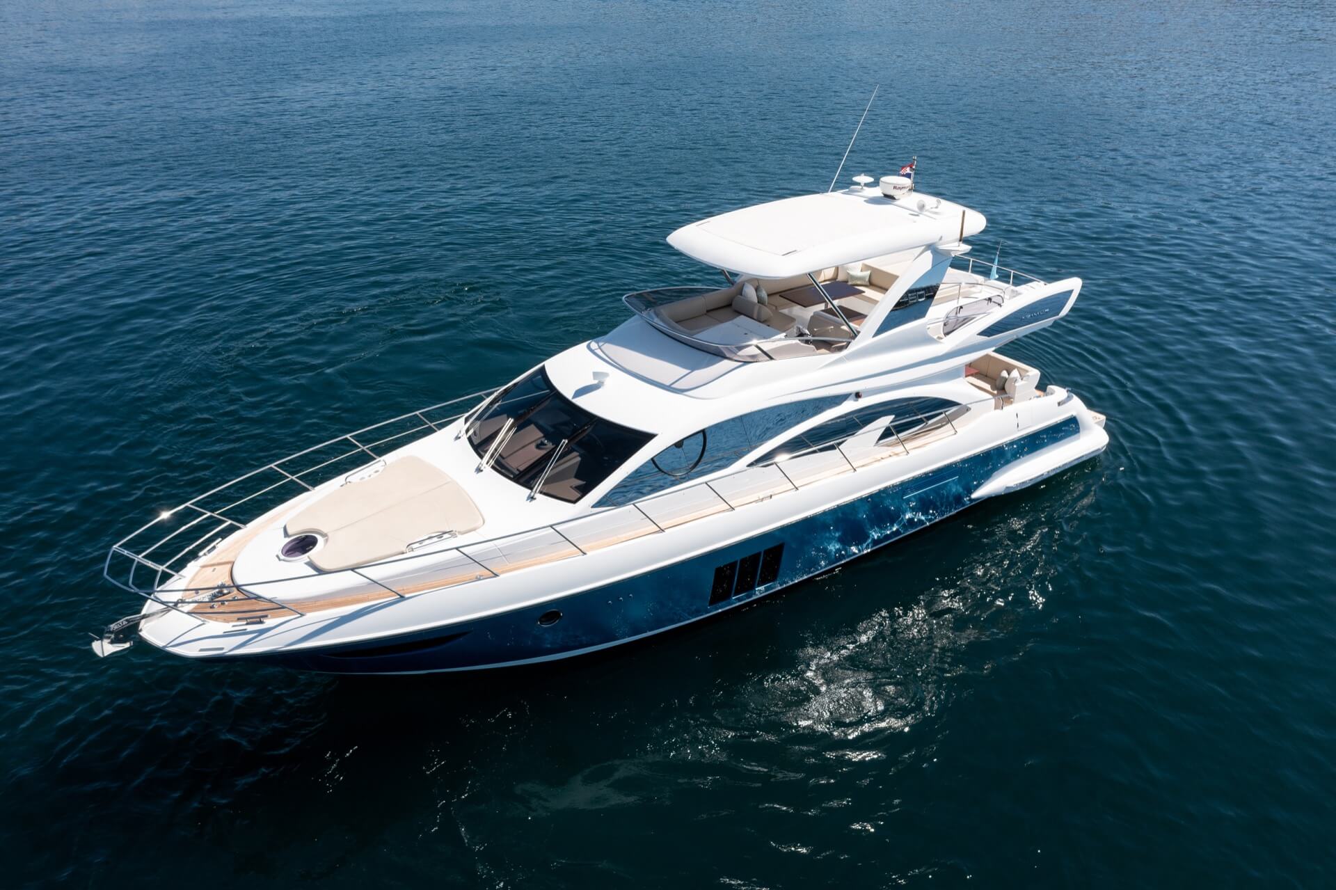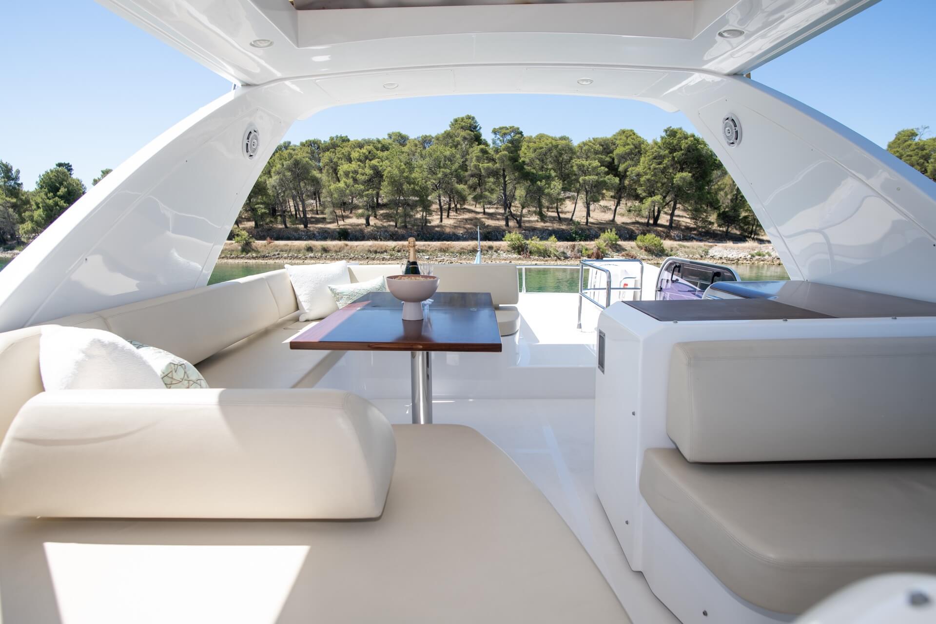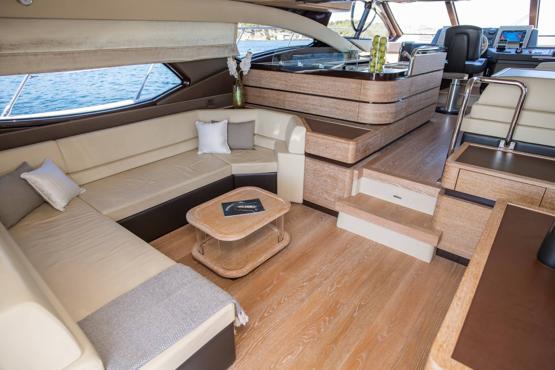 Impressive look and additional space in lowerdeck and bow cabine. Full height windows in salon for convertible dinette/lounge zone. New 6 sqm (on 60-feet yacht) fore deck lounge convertible solution with bow bimini top with carbon fiber bimini poles. Extended flybridge becomes even more longer in new generation Azimut flybridge yachts. Flybridge supports have additional feature of privacy curtain with electric system and remote control.