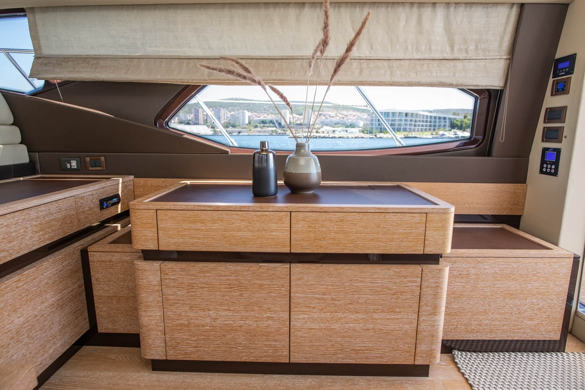 Salvagni uses extremely rich materials to conjure up the idea of the voyage, practical and sophisticated, with a close eye for detail and fine finishes, which represents an absolute novelty in the world of yachts this size. Only one step from living area to galley
