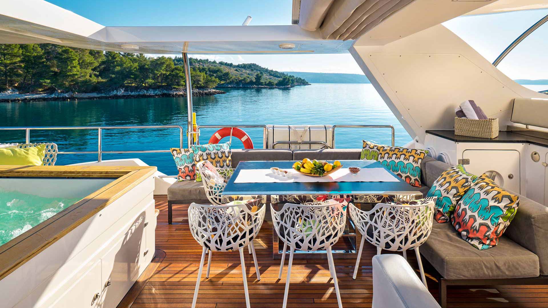 Deck with dining area, Indoor dining, Minibar outside, Separate cabins for cews, Sun MattressesDeck equipment: