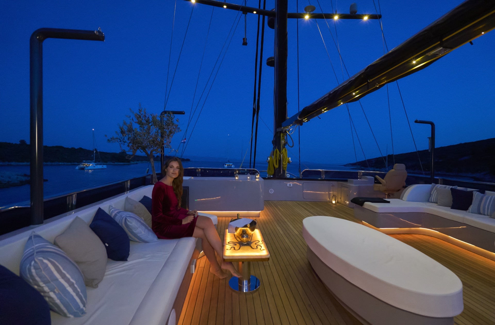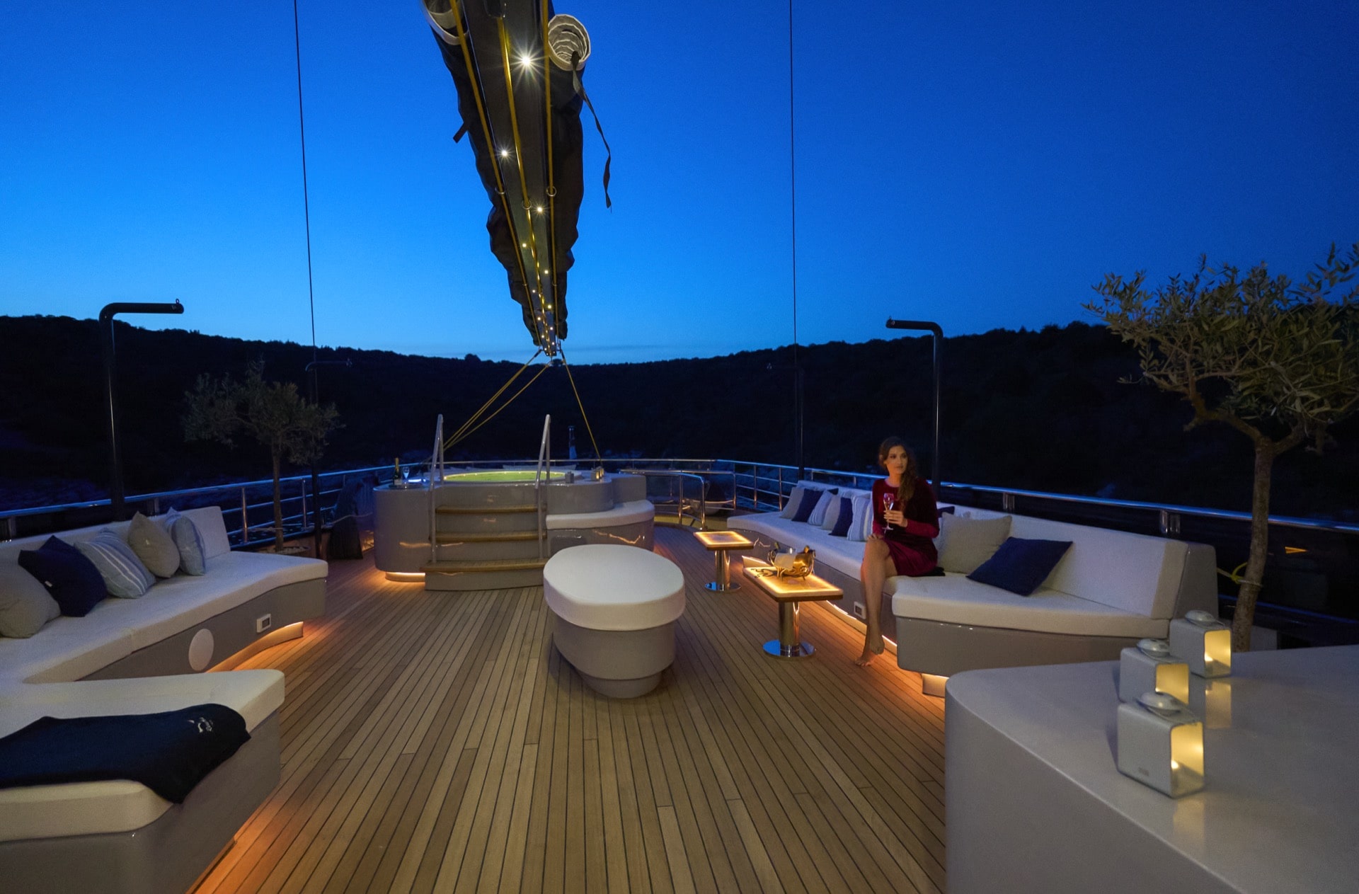 - The sundeck with large Jacuzzi surrounded by cushioned area, sun mattresses, outside shower and two seating areas with coffee tables, all under a lovely shade and masts