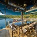 Enjoy the fully equipped lounge area and its homely vibe. The highlight of the Rara Avis are its external amenities: the sundeck with a large cushioned area, the Jacuzzi and outside shower, as well as the shaded rear deck set up for al fresco dining. Indulge your senses with exceptional gastronomy on board during this motor yacht charter to remember.