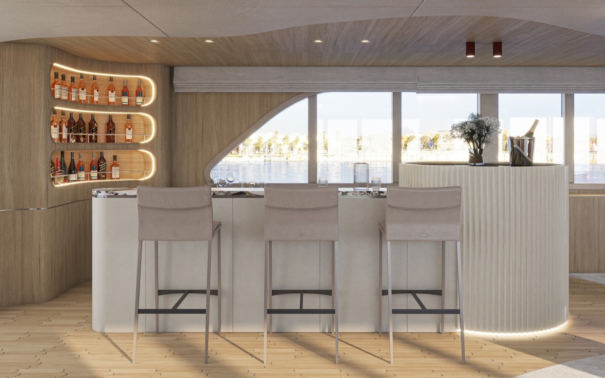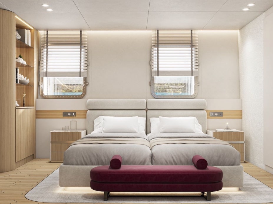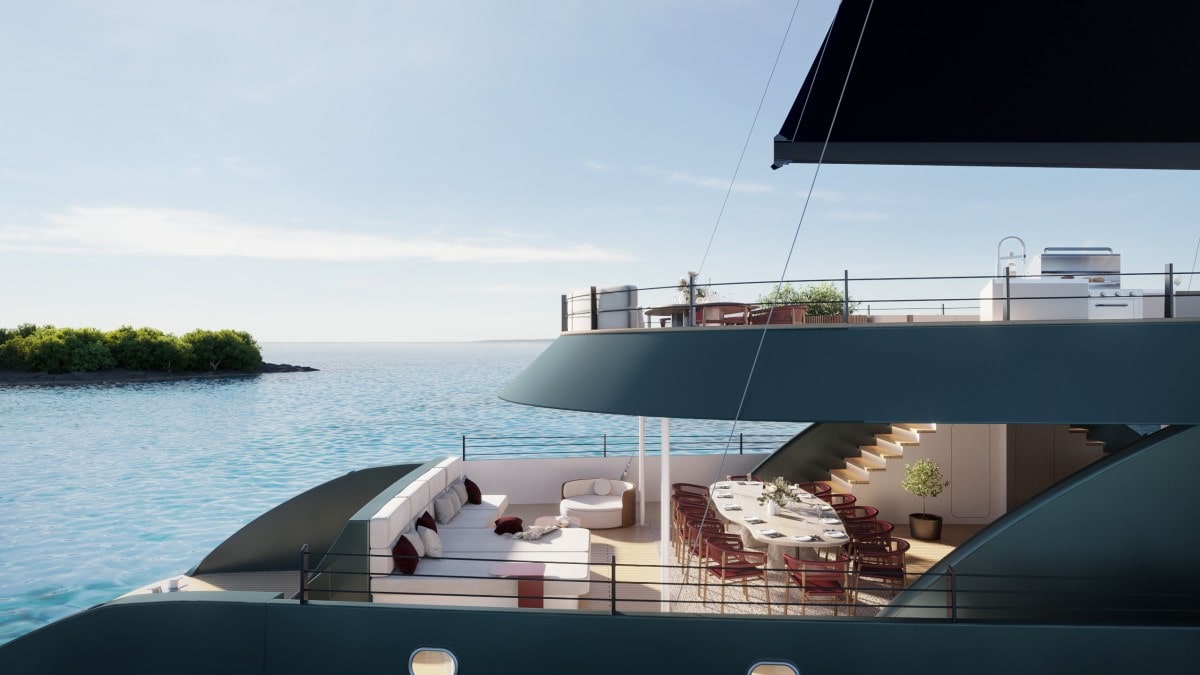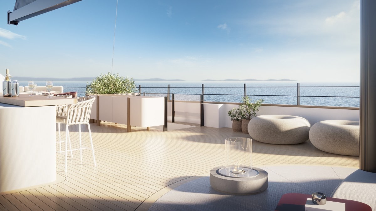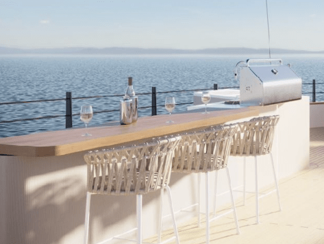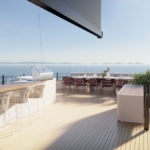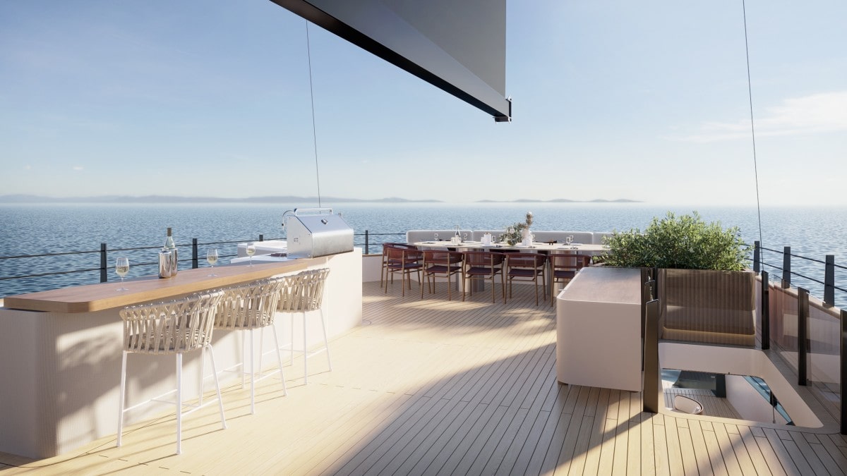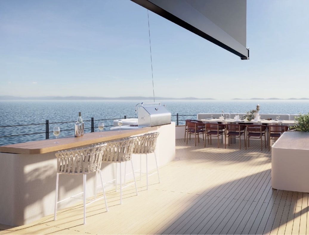 Outside speakers, Deck with dining area, Indoor dining, Minibar outside, Separate cabins for cews, Sun Mattresses, Ice maker, Summer tent, Coffee machine, Electric fridge, TowelsSafety equipment: