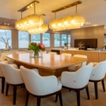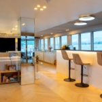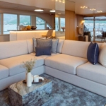 While the transom door at the swim platform hides another lounge area with a variety of watersports, the indoor salon reveals as a sophisticated yet intimate dining and bar area.