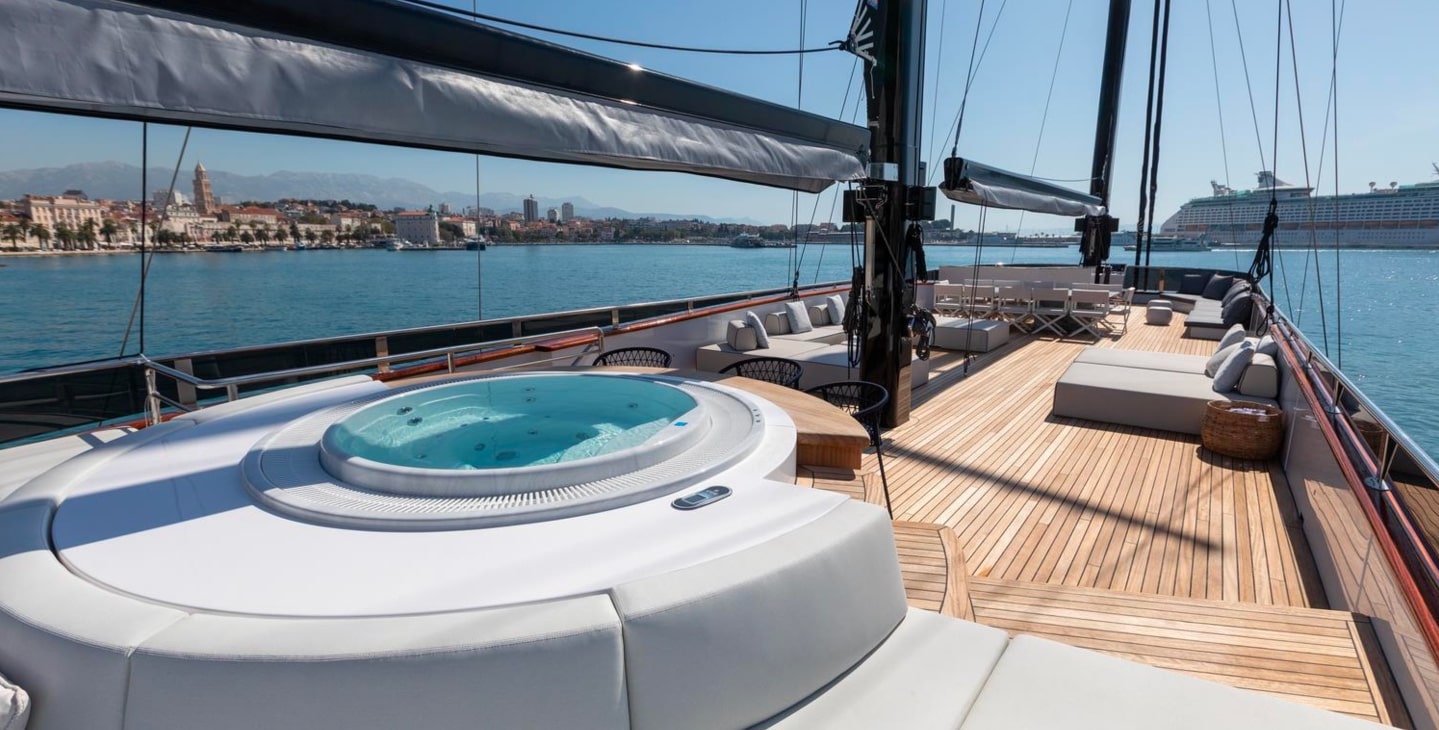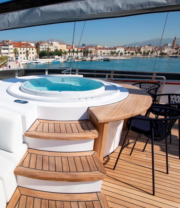 Outside, a sundeck features sun beds, a vast lounge & dining area, a jacuzzi, and a grill bar. On the other hand, the main deck offers a more intimate lounge and dining area, ideal for soaking up the sun in a relaxed ambiance.