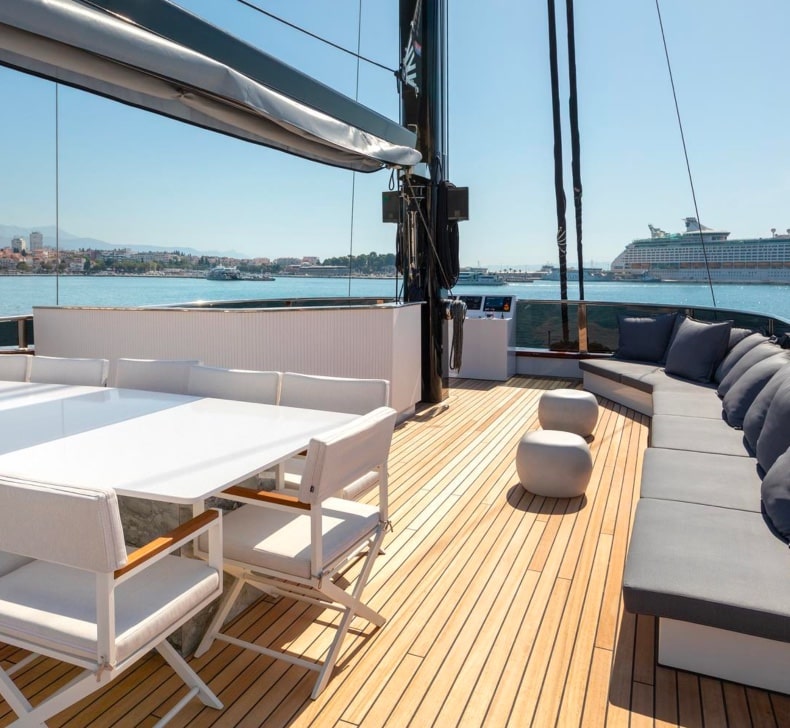 Outside speakers, Deck with dining area, Indoor dining, Minibar outside, Separate cabins for cews, Sun Mattresses, Ice maker, Summer tent, Coffee machine, Electric fridge, TowelsSafety equipment: