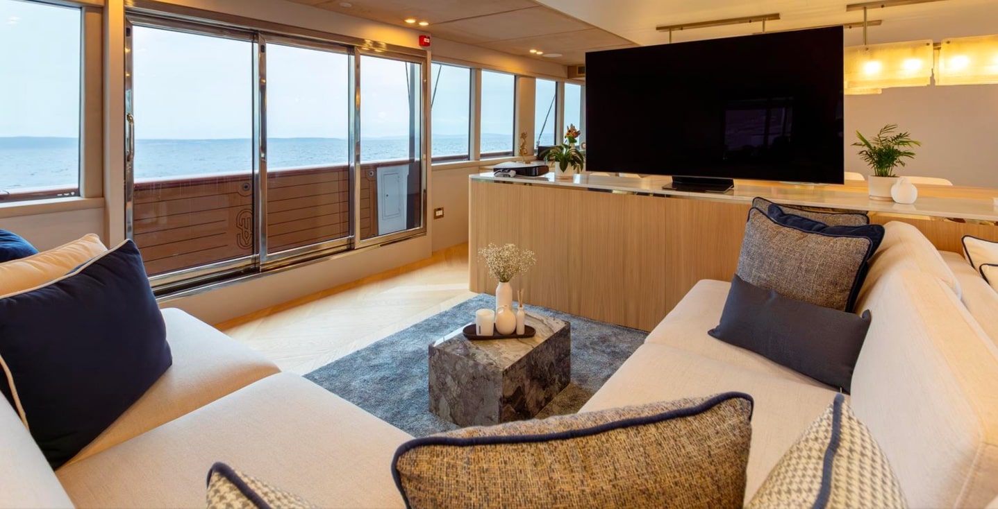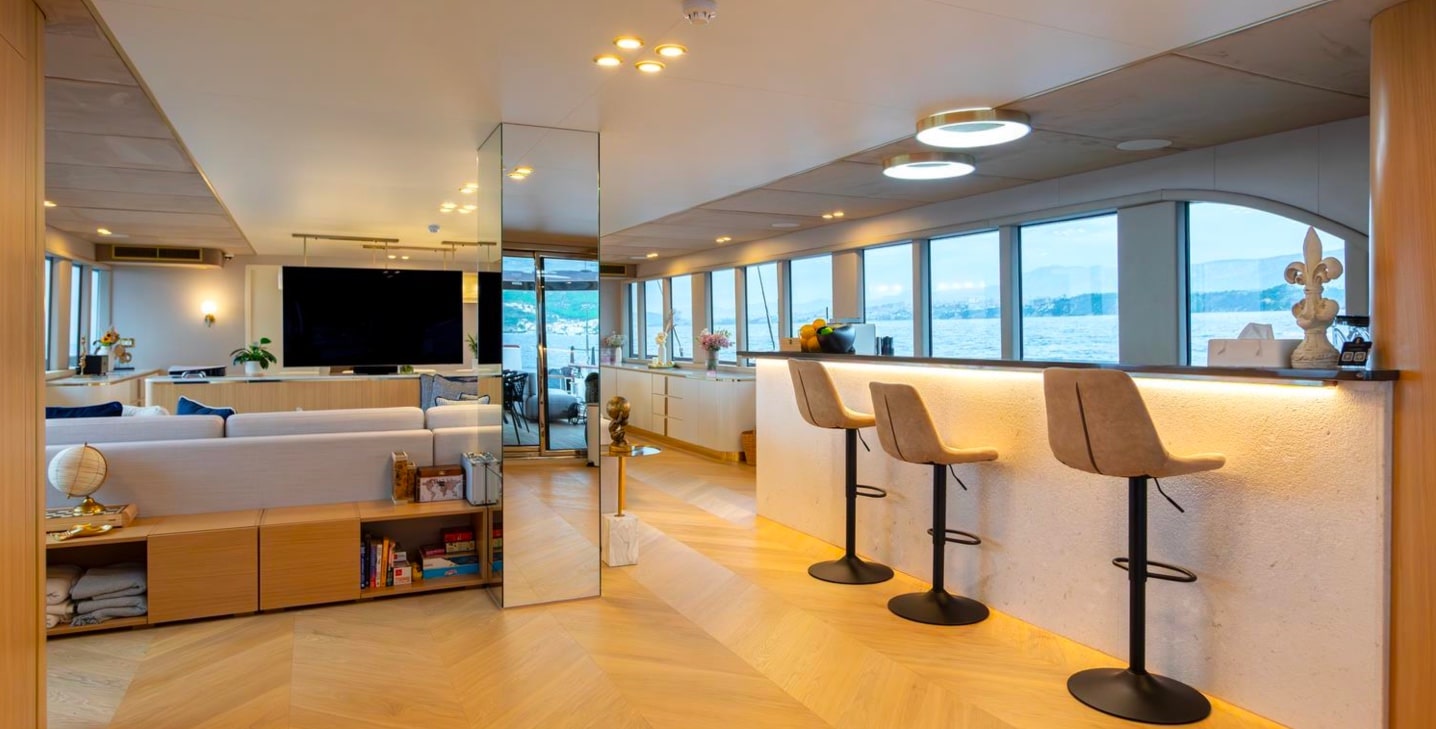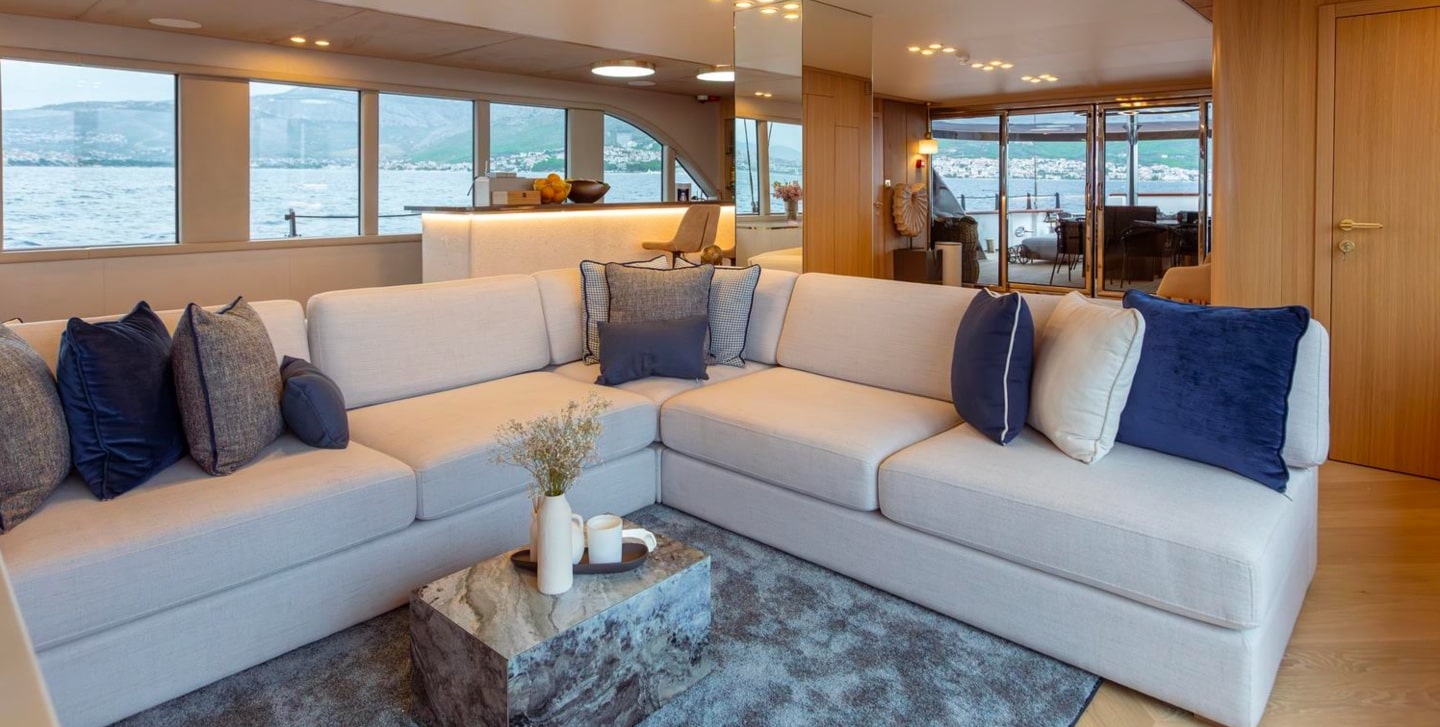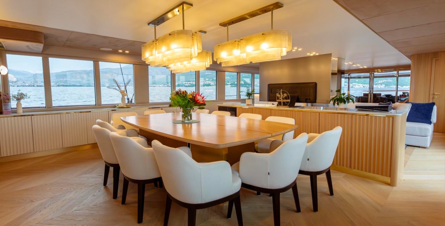 While the transom door at the swim platform hides another lounge area with a variety of watersports, the indoor salon reveals as a sophisticated yet intimate dining and bar area.