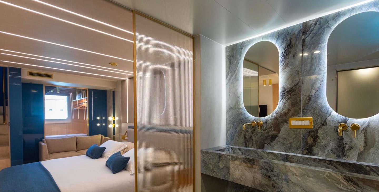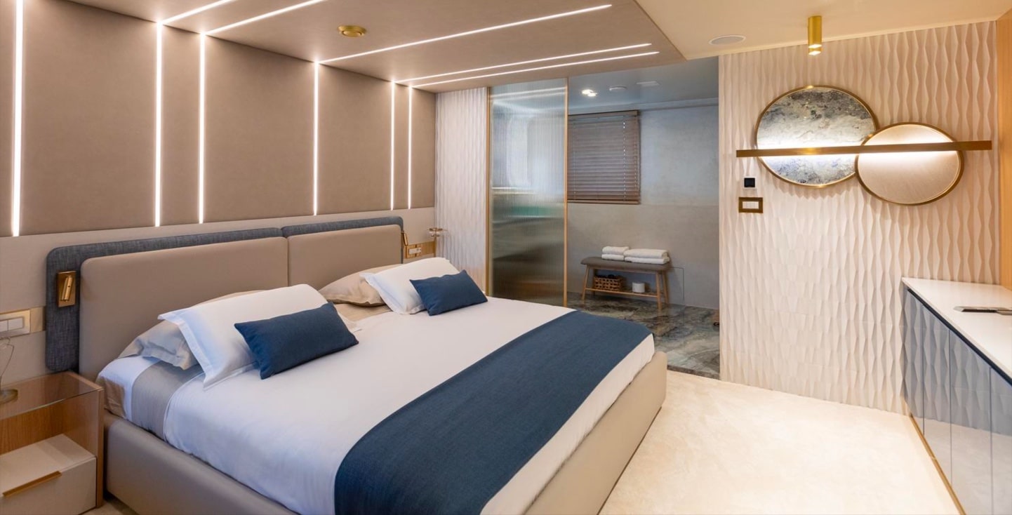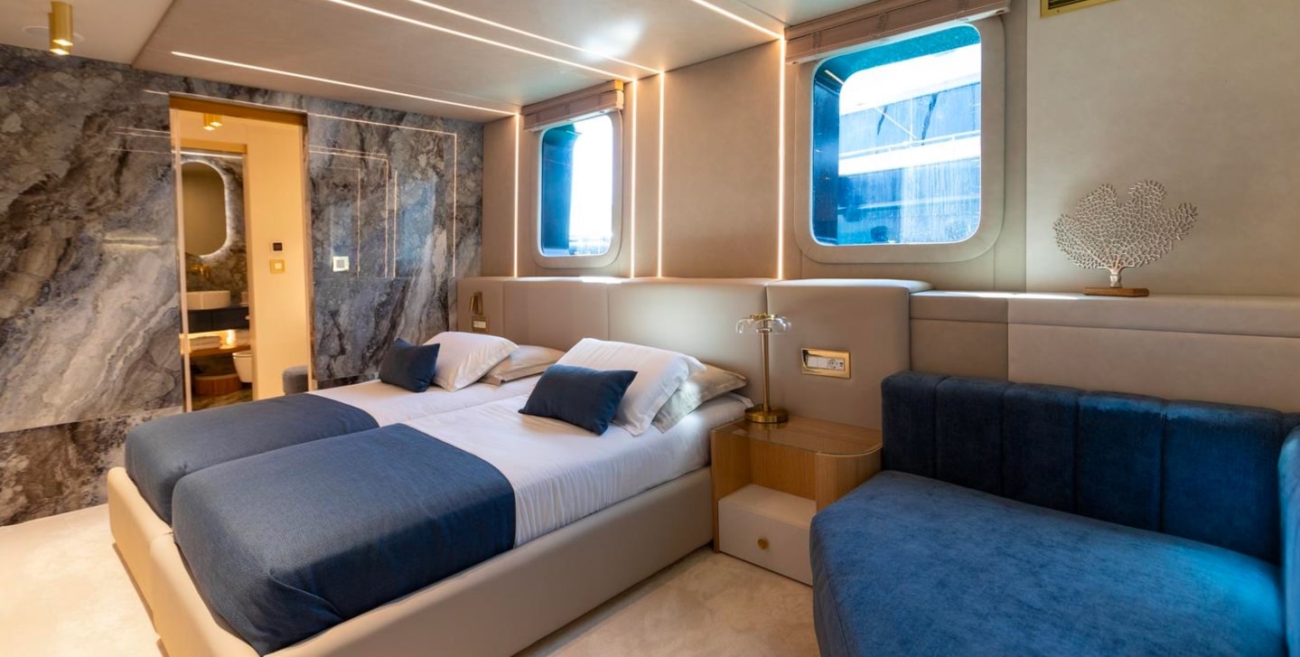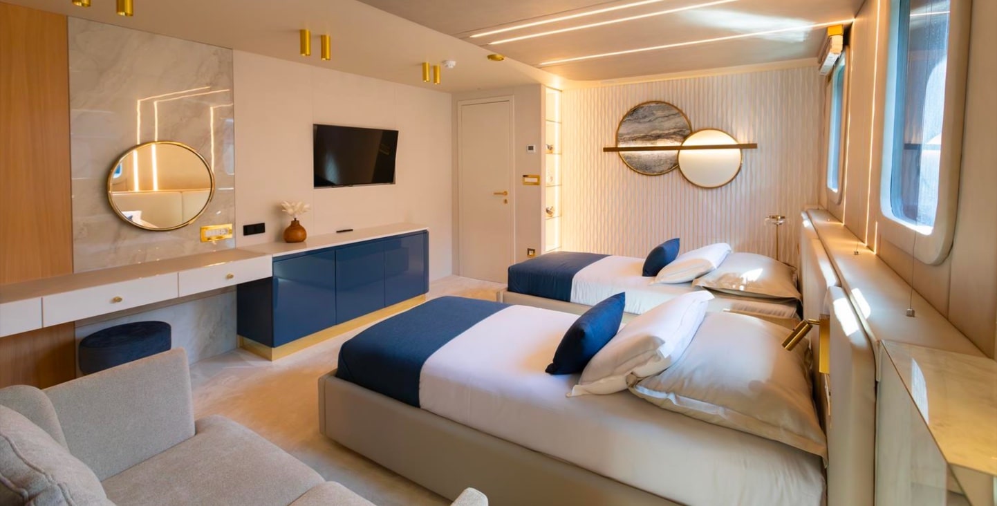 Impeccably designed 6 cabins with en suite marble bathrooms, equipped with bathtub and walk-in wardrobes come with the latest technology – flat-screen TVs, sound system, Wi-Fi, and air conditioning