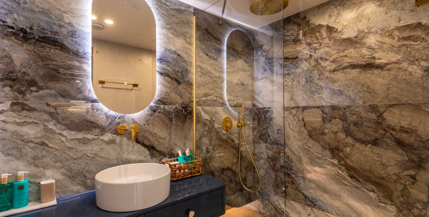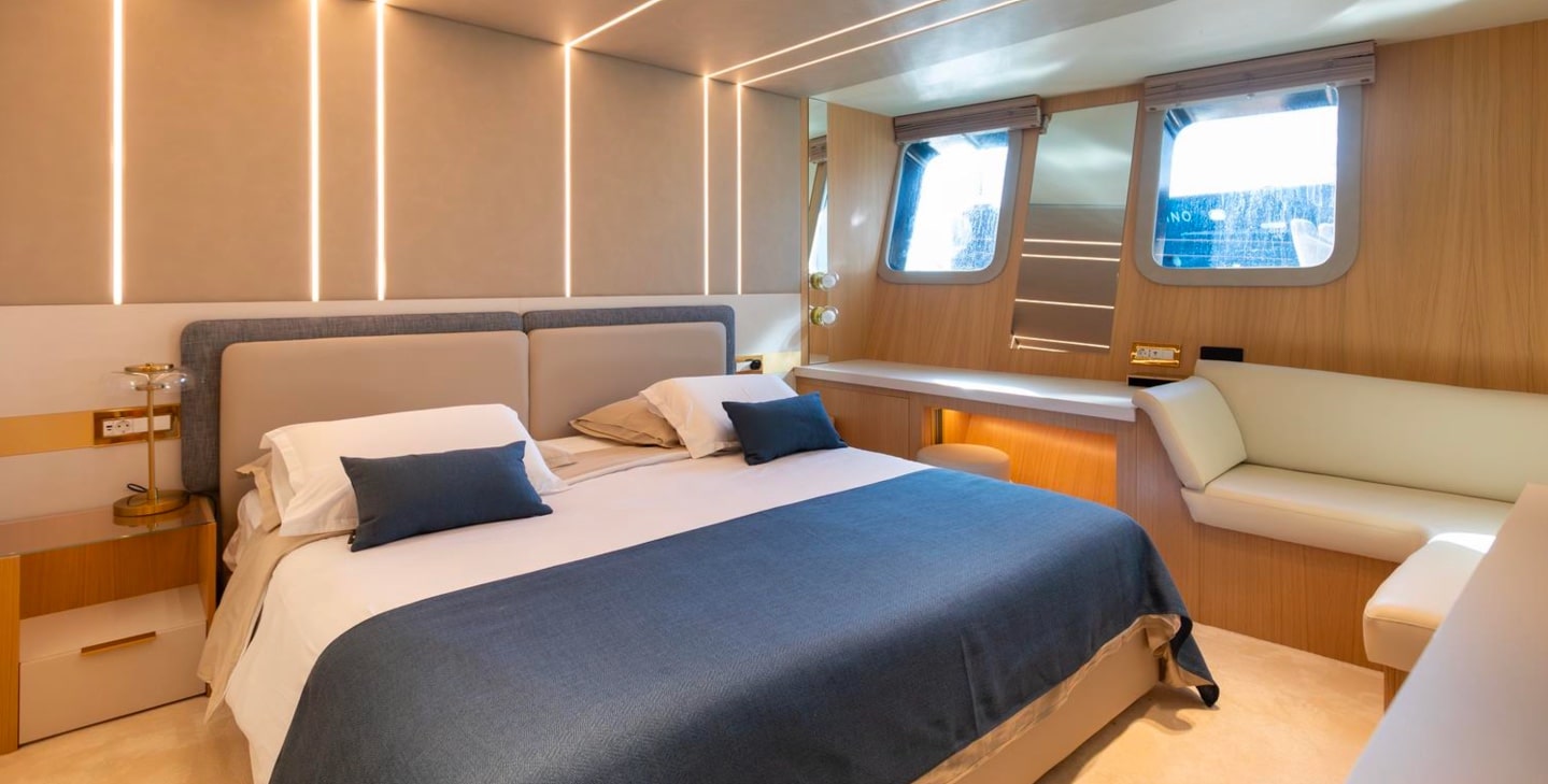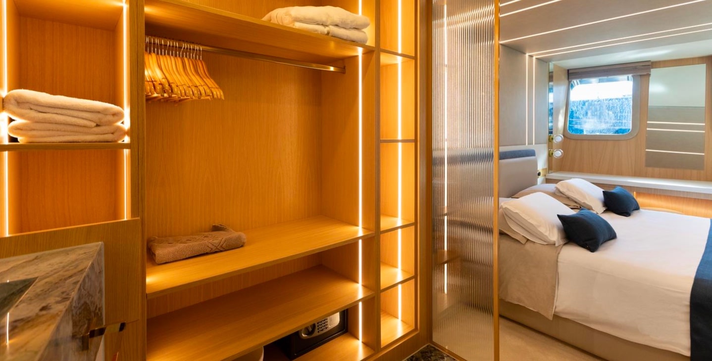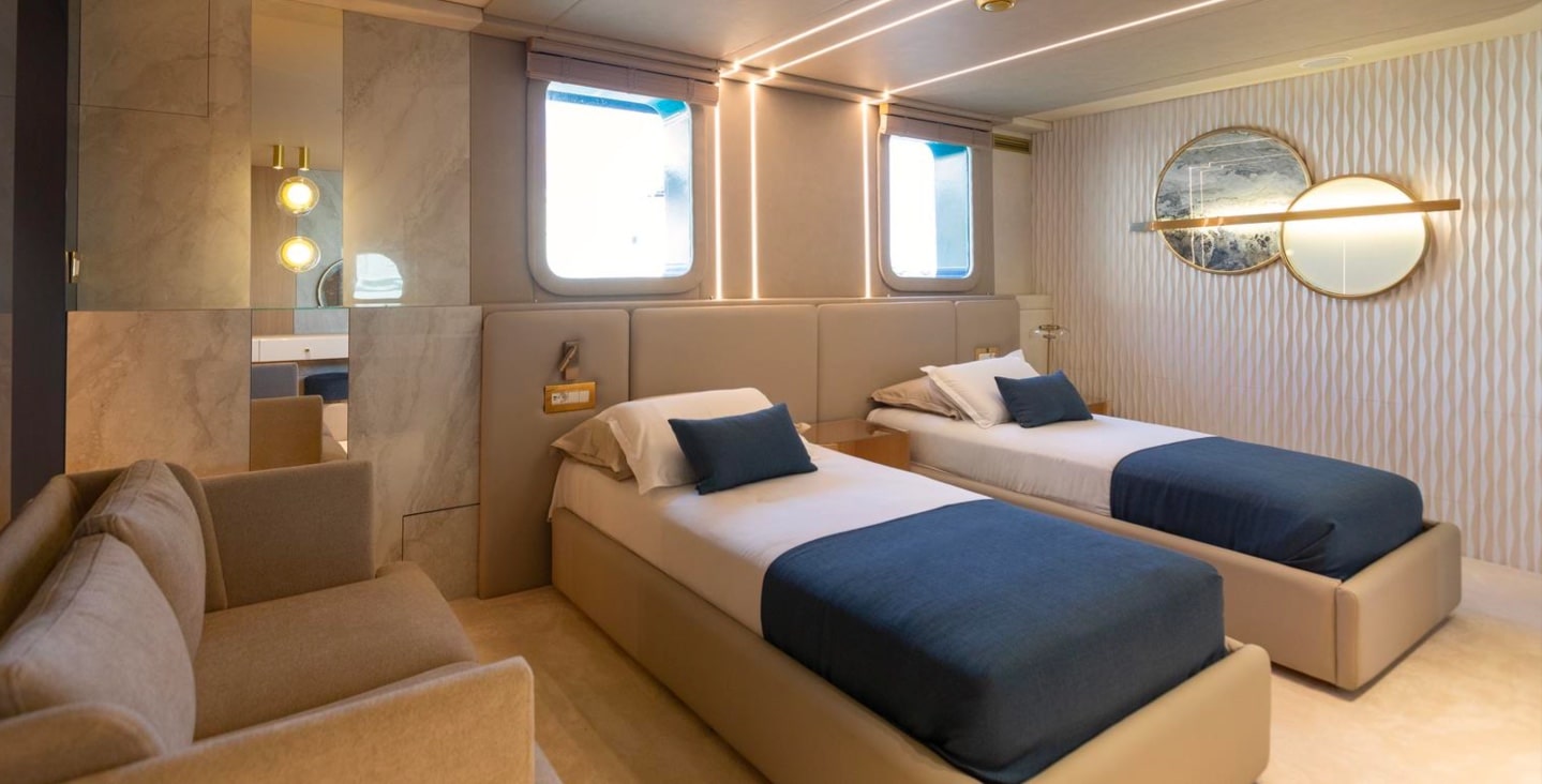 Impeccably designed 6 cabins with en suite marble bathrooms, equipped with bathtub and walk-in wardrobes come with the latest technology – flat-screen TVs, sound system, Wi-Fi, and air conditioning