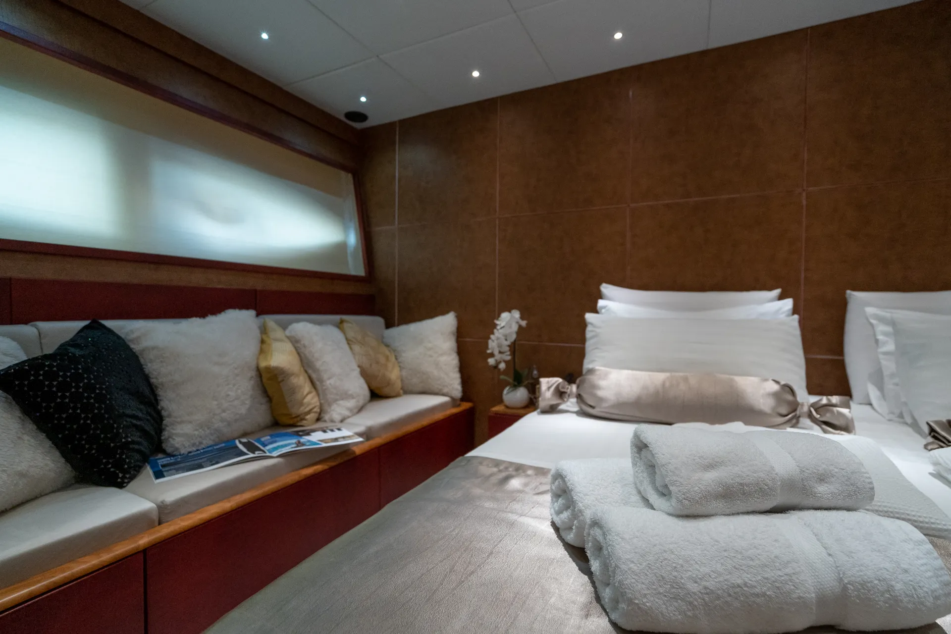 The F68 deluxe motor yacht is guaranteed to float your boat and get you ready for a maritime adventure of a lifetime! She’s sleek, comfortable and minimalistic, yet ideal for maximum pleasure. The custom design makes her all the more special. Some would say she’s a Ritz on waves. She can accommodate up to 6 guests in her luxurious sleeping cabins. Entertainment equipment comprises outdoor speakers for blasting your favorite music, as well as a Smart TV and LCD TVs for Netflix and chill, but also thrill. Tender and water toys include Williams 325 jet 104 hp, water skis, snorkeling equipment and water tube. This boat has all the appliances you can imagine. The only thing that will make you want to get off this yacht is the dazzling Croatian landscape.
